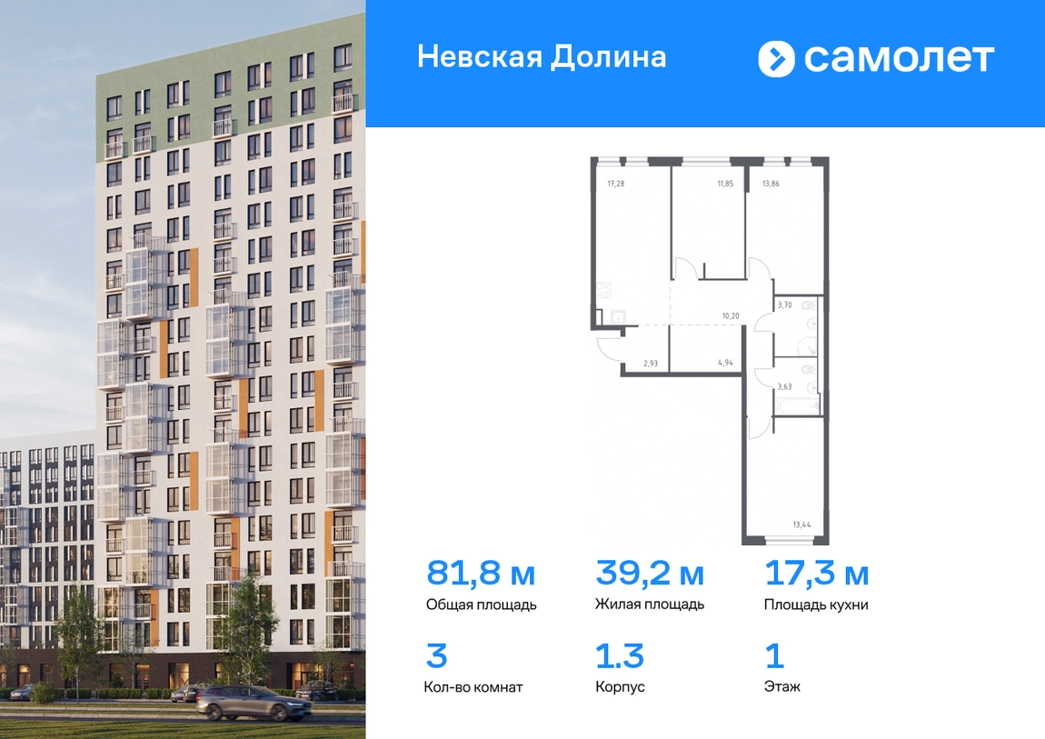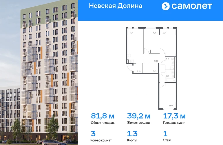 Строим кварталы для жизни с заботой о будущем. Предлагается 3-комнатная квартира комфорт-класса 81,83 кв.м в корпусе 1.3 на 1 этаже, в ЖК «Невская Долина» Квартира с чистовой отделкой. Доступность дополнительных опций уточняйте у застройщика. Приобрести квартиру возможно по специальным акциям от застройщика, с текущими условиями акций можно ознакомиться в блоке «Акций». Цена динамическая и может отличаться, уточняйте актуальность у застройщика. «Невская Долина» — зеленый холст для вашей жизни с уникальными палисадниками, садами и уютными уголками для отдыха. Всего в 5 минутах на машине — КАД, рядом — Большой Обуховский мост. До центра Петербурга — 35 минут на авто, до метро «Пролетарская» — 15 минут, до аэропорта Пулково — 30 минут. Комплекс находится на правом берегу Невы, рядом с Невским лесопарком, «МЕГА Парком» и парком развлечений. Скоро во дворе комплекса построят 4 детских сада и 2 школы. Рядом уже есть магазины «Дикси», «Магнит», пункты выдачи и аптеки. На первых этажах будут кафе и минимаркеты, откроется медицинский центр и физкультурно-оздоровительный комплекс. Архитектура домов сочетает в себе современность и функциональность — фасады украшены большими окнами, лоджиями, обычными и французскими балконами. В «Невской Долине» есть сады плодовых культур, игровые и спортивные зоны, 11 многоуровневых паркингов.#yan19-2r1459880#О застройщике