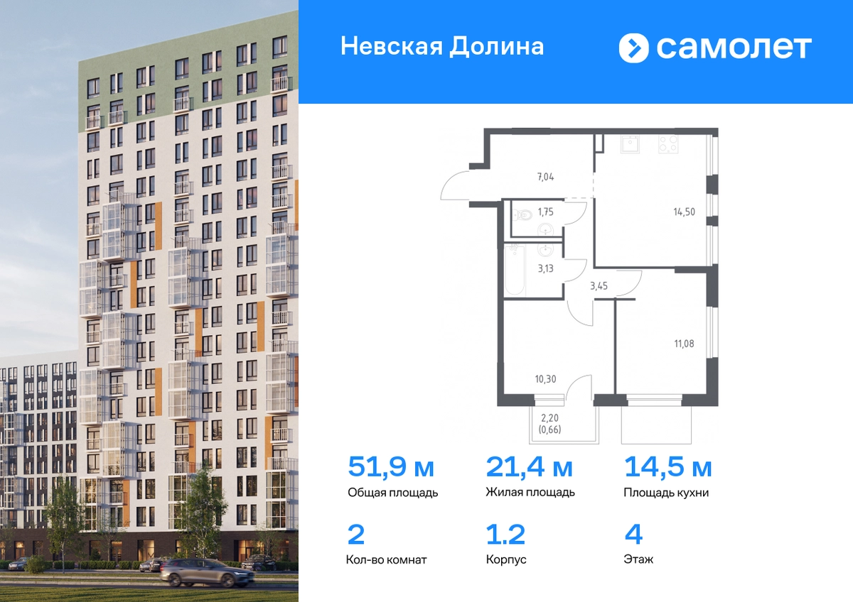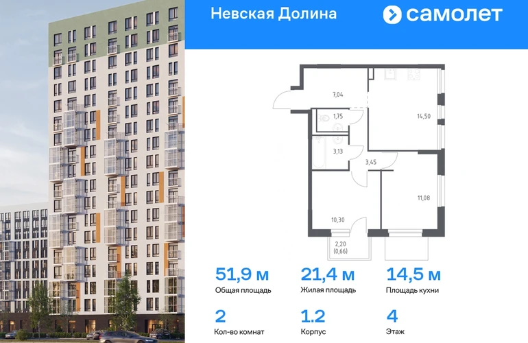 Строим кварталы для жизни с заботой о будущем. Предлагается 2-комнатная квартира комфорт-класса 51,91 кв.м в корпусе 1.2 на 4 этаже, в ЖК «Невская Долина» Квартира без отделки. Доступность опции «отделка» и возможность комплектации мебелью и декором уточняйте у застройщика. Приобрести квартиру возможно по специальным акциям от застройщика, с текущими условиями акций можно ознакомиться в блоке «Акций». Цена динамическая и может отличаться, уточняйте актуальность у застройщика. «Невская Долина» — зеленый холст для вашей жизни с уникальными палисадниками, садами и уютными уголками для отдыха. Всего в 5 минутах на машине — КАД, рядом — Большой Обуховский мост. До центра Петербурга — 35 минут на авто, до метро «Пролетарская» — 15 минут, до аэропорта Пулково — 30 минут. Комплекс находится на правом берегу Невы, рядом с Невским лесопарком, «МЕГА Парком» и парком развлечений. Скоро во дворе комплекса построят 4 детских сада и 2 школы. Рядом уже есть магазины «Дикси», «Магнит», пункты выдачи и аптеки. На первых этажах будут кафе и минимаркеты, откроется медицинский центр и физкультурно-оздоровительный комплекс. Архитектура домов сочетает в себе современность и функциональность — фасады украшены большими окнами, лоджиями, обычными и французскими балконами. В «Невской Долине» есть сады плодовых культур, игровые и спортивные зоны, 11 многоуровневых паркингов.#yan19-2r1555003#О застройщике