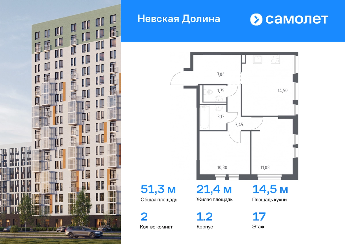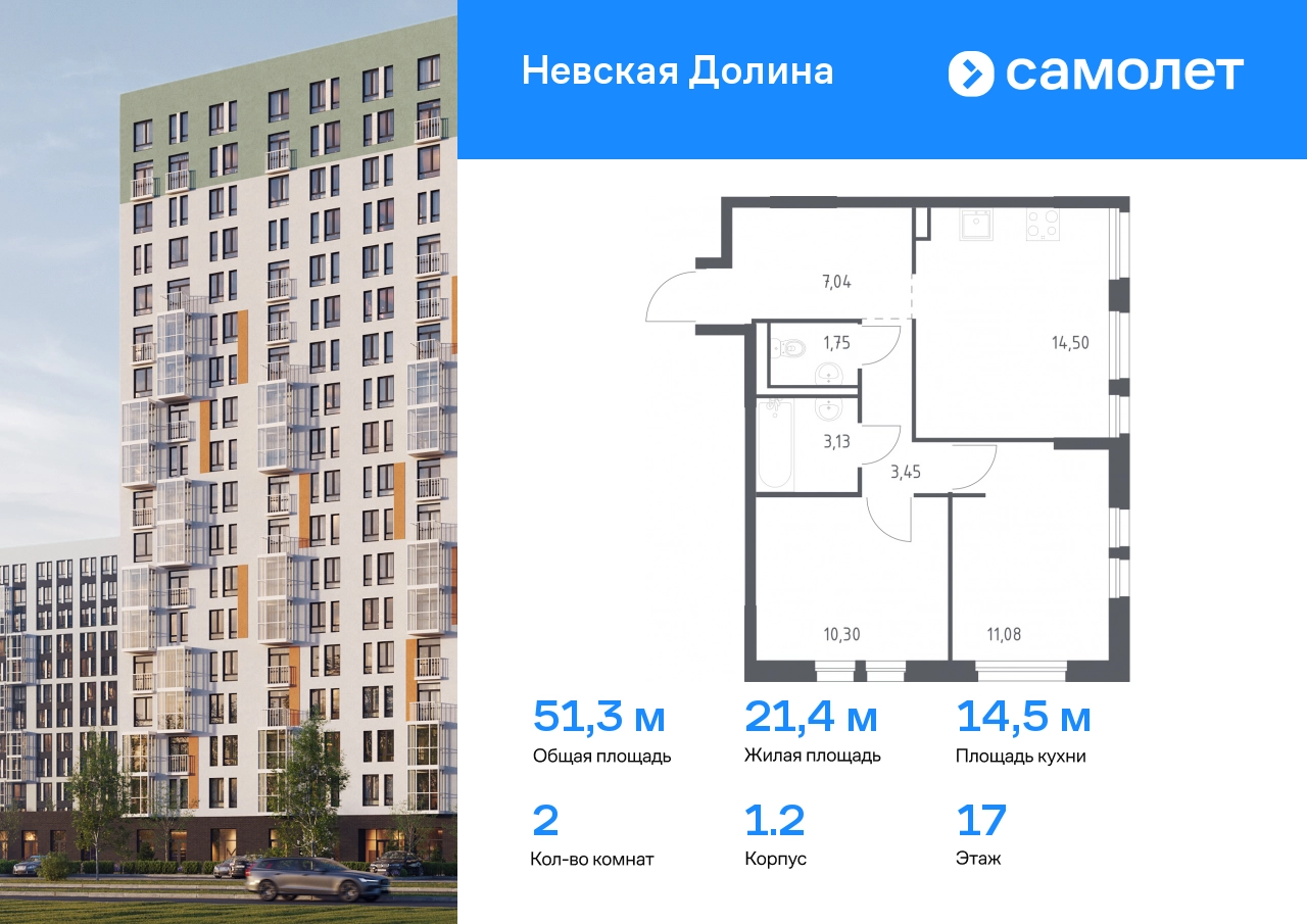 Строим кварталы для жизни с заботой о будущем. Предлагается 2-комнатная квартира комфорт-класса 51,25 кв.м в корпусе 1.2 на 17 этаже, в ЖК «Невская Долина» Квартира без отделки. Доступность опции «отделка» и возможность комплектации мебелью и декором уточняйте у застройщика. Приобрести квартиру возможно по специальным акциям от застройщика, с текущими условиями акций можно ознакомиться в блоке «Акций». Цена динамическая и может отличаться, уточняйте актуальность у застройщика. «Невская Долина» — зеленый холст для вашей жизни с уникальными палисадниками, садами и уютными уголками для отдыха. Всего в 5 минутах на машине — КАД, рядом — Большой Обуховский мост. До центра Петербурга — 35 минут на авто, до метро «Пролетарская» — 15 минут, до аэропорта Пулково — 30 минут. Комплекс находится на правом берегу Невы, рядом с Невским лесопарком, «МЕГА Парком» и парком развлечений. Скоро во дворе комплекса построят 4 детских сада и 2 школы. Рядом уже есть магазины «Дикси», «Магнит», пункты выдачи и аптеки. На первых этажах будут кафе и минимаркеты, откроется медицинский центр и физкультурно-оздоровительный комплекс. Архитектура домов сочетает в себе современность и функциональность — фасады украшены большими окнами, лоджиями, обычными и французскими балконами. В «Невской Долине» есть сады плодовых культур, игровые и спортивные зоны, 11 многоуровневых паркингов.#yan19-2r1555004#О застройщике
