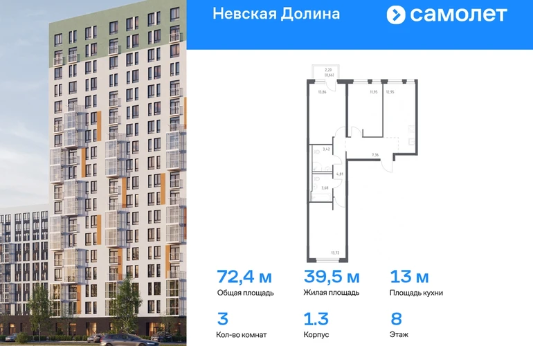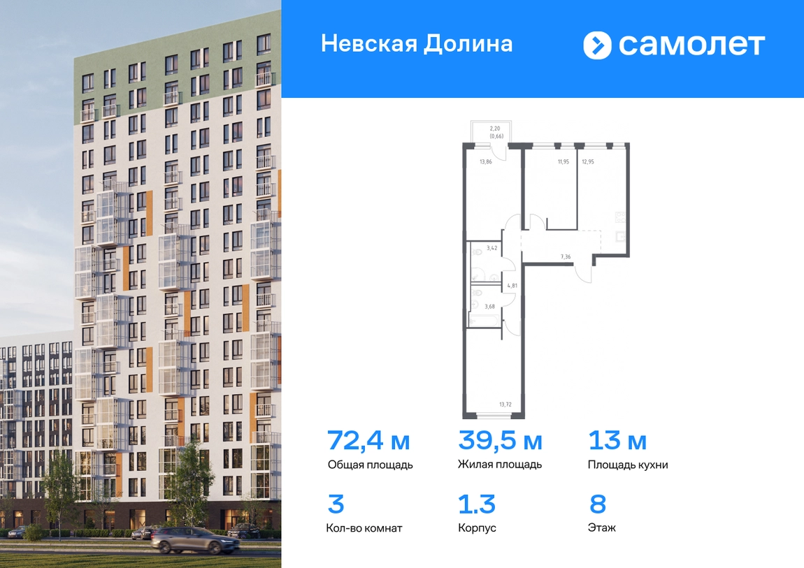 Строим кварталы для жизни с заботой о будущем. Предлагается 3-комнатная квартира комфорт-класса 72,41 кв.м в корпусе 1.3 на 8 этаже, в ЖК «Невская Долина» Квартира с чистовой отделкой. Доступность дополнительных опций уточняйте у застройщика. Приобрести квартиру возможно по специальным акциям от застройщика, с текущими условиями акций можно ознакомиться в блоке «Акций». Цена динамическая и может отличаться, уточняйте актуальность у застройщика. «Невская Долина» — зеленый холст для вашей жизни с уникальными палисадниками, садами и уютными уголками для отдыха. Всего в 5 минутах на машине — КАД, рядом — Большой Обуховский мост. До центра Петербурга — 35 минут на авто, до метро «Пролетарская» — 15 минут, до аэропорта Пулково — 30 минут. Комплекс находится на правом берегу Невы, рядом с Невским лесопарком, «МЕГА Парком» и парком развлечений. Скоро во дворе комплекса построят 4 детских сада и 2 школы. Рядом уже есть магазины «Дикси», «Магнит», пункты выдачи и аптеки. На первых этажах будут кафе и минимаркеты, откроется медицинский центр и физкультурно-оздоровительный комплекс. Архитектура домов сочетает в себе современность и функциональность — фасады украшены большими окнами, лоджиями, обычными и французскими балконами. В «Невской Долине» есть сады плодовых культур, игровые и спортивные зоны, 11 многоуровневых паркингов.#yan19-2r1640184#О застройщике