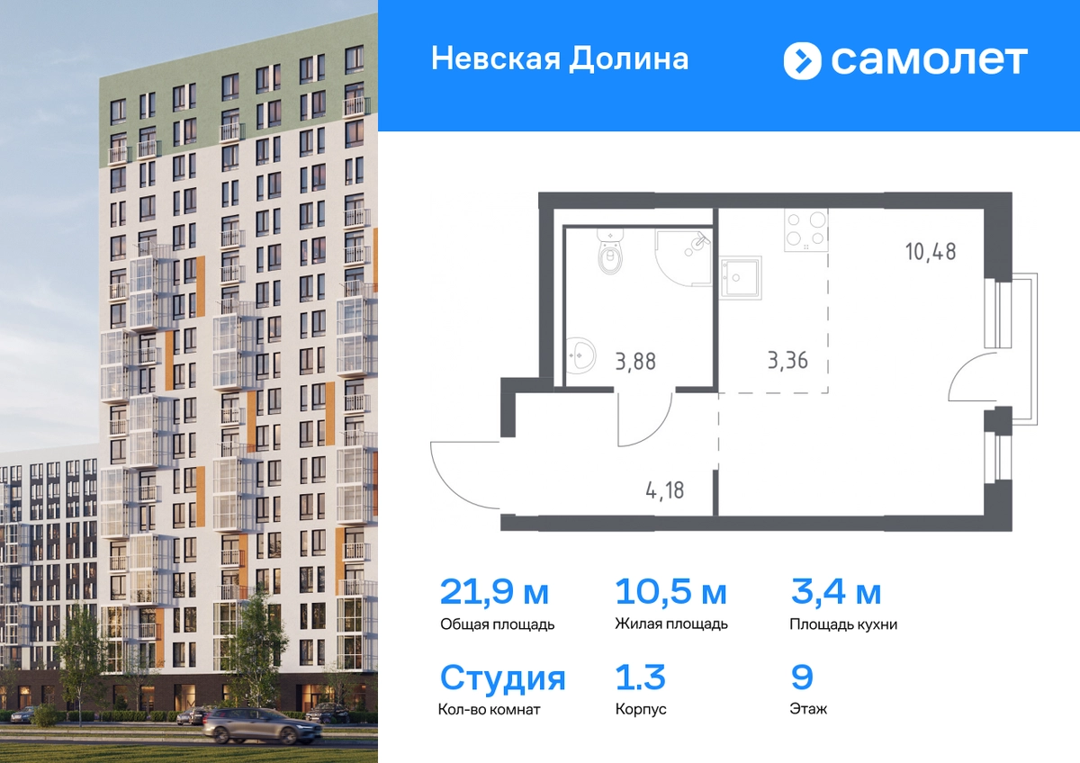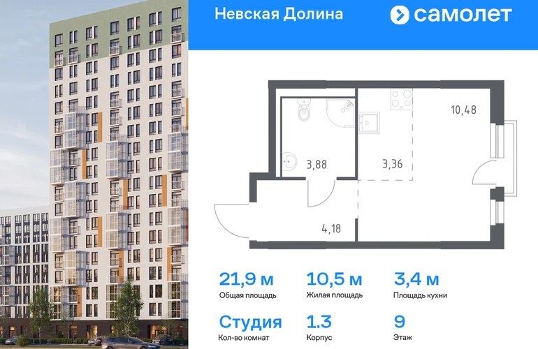 Строим кварталы для жизни с заботой о будущем. Предлагается квартира студия комфорт-класса 21,9 кв.м в корпусе 1.3 на 9 этаже, в ЖК «Невская Долина» Квартира с предчистовой отделкой. Доступность дополнительных опций уточняйте у застройщика. Приобрести квартиру возможно по специальным акциям от застройщика, с текущими условиями акций можно ознакомиться в блоке «Акций». Цена динамическая и может отличаться, уточняйте актуальность у застройщика. «Невская Долина» — зеленый холст для вашей жизни с уникальными палисадниками, садами и уютными уголками для отдыха. Всего в 5 минутах на машине — КАД, рядом — Большой Обуховский мост. До центра Петербурга — 35 минут на авто, до метро «Пролетарская» — 15 минут, до аэропорта Пулково — 30 минут. Комплекс находится на правом берегу Невы, рядом с Невским лесопарком, «МЕГА Парком» и парком развлечений. Скоро во дворе комплекса построят 4 детских сада и 2 школы. Рядом уже есть магазины «Дикси», «Магнит», пункты выдачи и аптеки. На первых этажах будут кафе и минимаркеты, откроется медицинский центр и физкультурно-оздоровительный комплекс. Архитектура домов сочетает в себе современность и функциональность — фасады украшены большими окнами, лоджиями, обычными и французскими балконами. В «Невской Долине» есть сады плодовых культур, игровые и спортивные зоны, 11 многоуровневых паркингов.#yan19-2r1678607#О застройщике