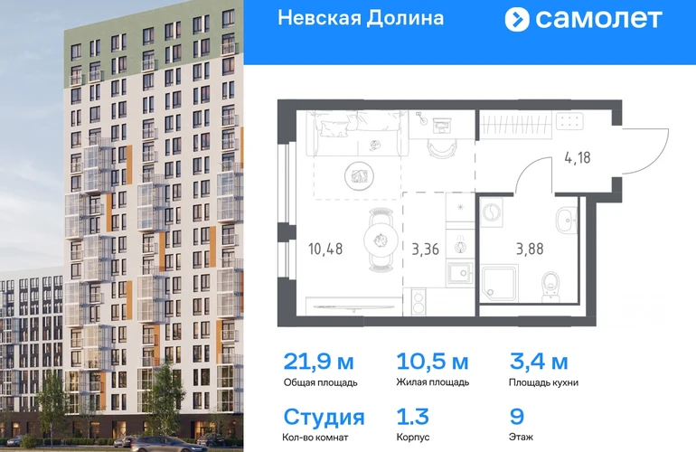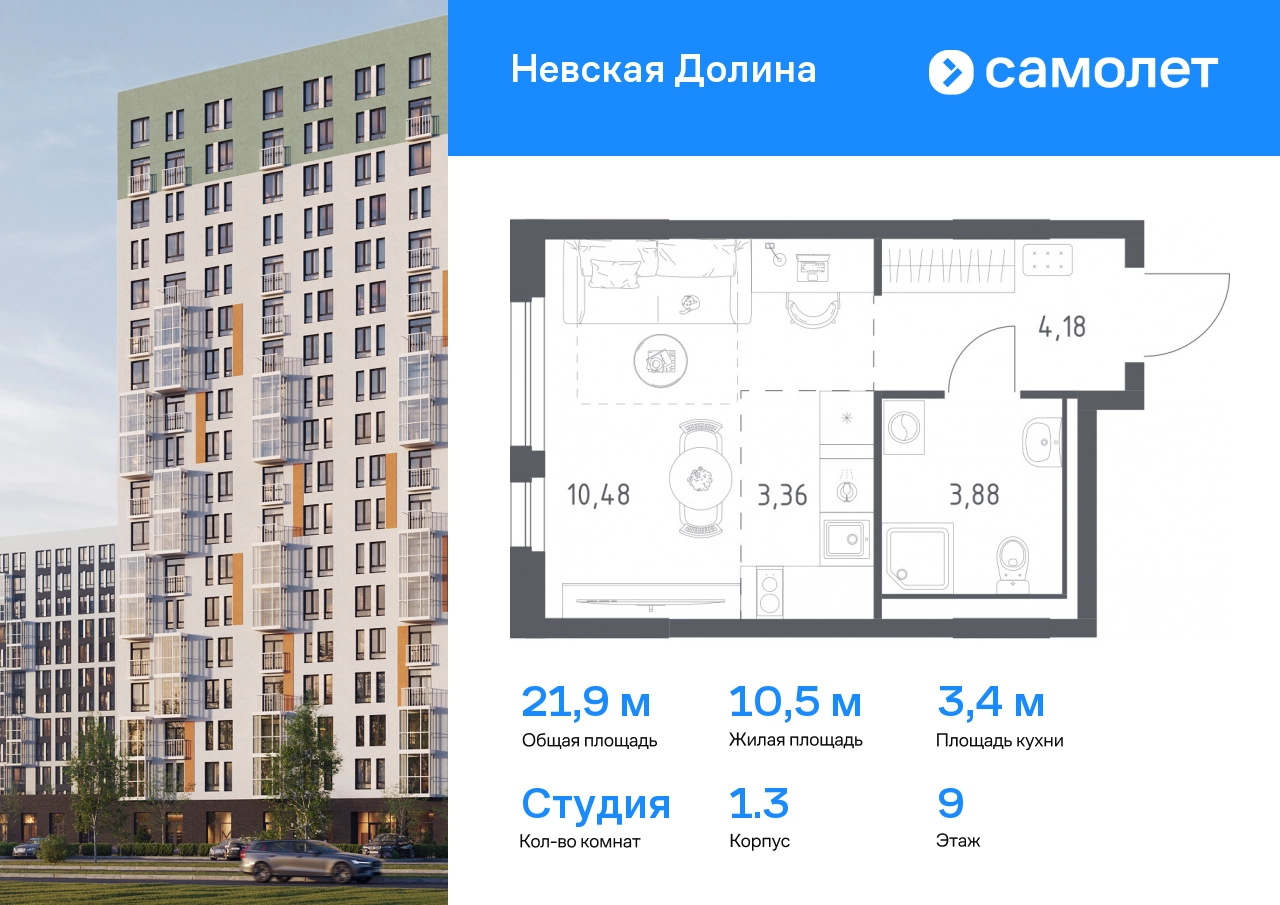 Строим кварталы для жизни с заботой о будущем. Предлагается квартира студия комфорт-класса 21,9 кв.м в корпусе 1.3 на 9 этаже, в ЖК «Невская Долина» Квартира с чистовой отделкой. Доступность дополнительных опций уточняйте у застройщика. Приобрести квартиру возможно по специальным акциям от застройщика, с текущими условиями акций можно ознакомиться в блоке «Акций». Цена динамическая и может отличаться, уточняйте актуальность у застройщика. «Невская Долина» — зеленый холст для вашей жизни с уникальными палисадниками, садами и уютными уголками для отдыха. Всего в 5 минутах на машине — КАД, рядом — Большой Обуховский мост. До центра Петербурга — 35 минут на авто, до метро «Пролетарская» — 15 минут, до аэропорта Пулково — 30 минут. Комплекс находится на правом берегу Невы, рядом с Невским лесопарком, «МЕГА Парком» и парком развлечений. Скоро во дворе комплекса построят 4 детских сада и 2 школы. Рядом уже есть магазины «Дикси», «Магнит», пункты выдачи и аптеки. На первых этажах будут кафе и минимаркеты, откроется медицинский центр и физкультурно-оздоровительный комплекс. Архитектура домов сочетает в себе современность и функциональность — фасады украшены большими окнами, лоджиями, обычными и французскими балконами. В «Невской Долине» есть сады плодовых культур, игровые и спортивные зоны, 11 многоуровневых паркингов.#yan19-2r1784394#О застройщике