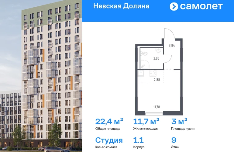 Строим кварталы для жизни с заботой о будущем. Предлагается квартира студия комфорт-класса 22,38 кв.м в корпусе 1.1 на 9 этаже, в ЖК «Невская Долина» Квартира с чистовой отделкой. Доступность дополнительных опций уточняйте у застройщика. Приобрести квартиру возможно по специальным акциям от застройщика, с текущими условиями акций можно ознакомиться в блоке «Акций». Цена динамическая и может отличаться, уточняйте актуальность у застройщика. «Невская Долина» — зеленый холст для вашей жизни с уникальными палисадниками, садами и уютными уголками для отдыха. Всего в 5 минутах на машине — КАД, рядом — Большой Обуховский мост. До центра Петербурга — 35 минут на авто, до метро «Пролетарская» — 15 минут, до аэропорта Пулково — 30 минут. Комплекс находится на правом берегу Невы, рядом с Невским лесопарком, «МЕГА Парком» и парком развлечений. Скоро во дворе комплекса построят 4 детских сада и 2 школы. Рядом уже есть магазины «Дикси», «Магнит», пункты выдачи и аптеки. На первых этажах будут кафе и минимаркеты, откроется медицинский центр и физкультурно-оздоровительный комплекс. Архитектура домов сочетает в себе современность и функциональность — фасады украшены большими окнами, лоджиями, обычными и французскими балконами. В «Невской Долине» есть сады плодовых культур, игровые и спортивные зоны, 11 многоуровневых паркингов.#yan19-2r1821603#О застройщике