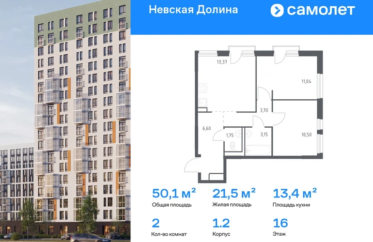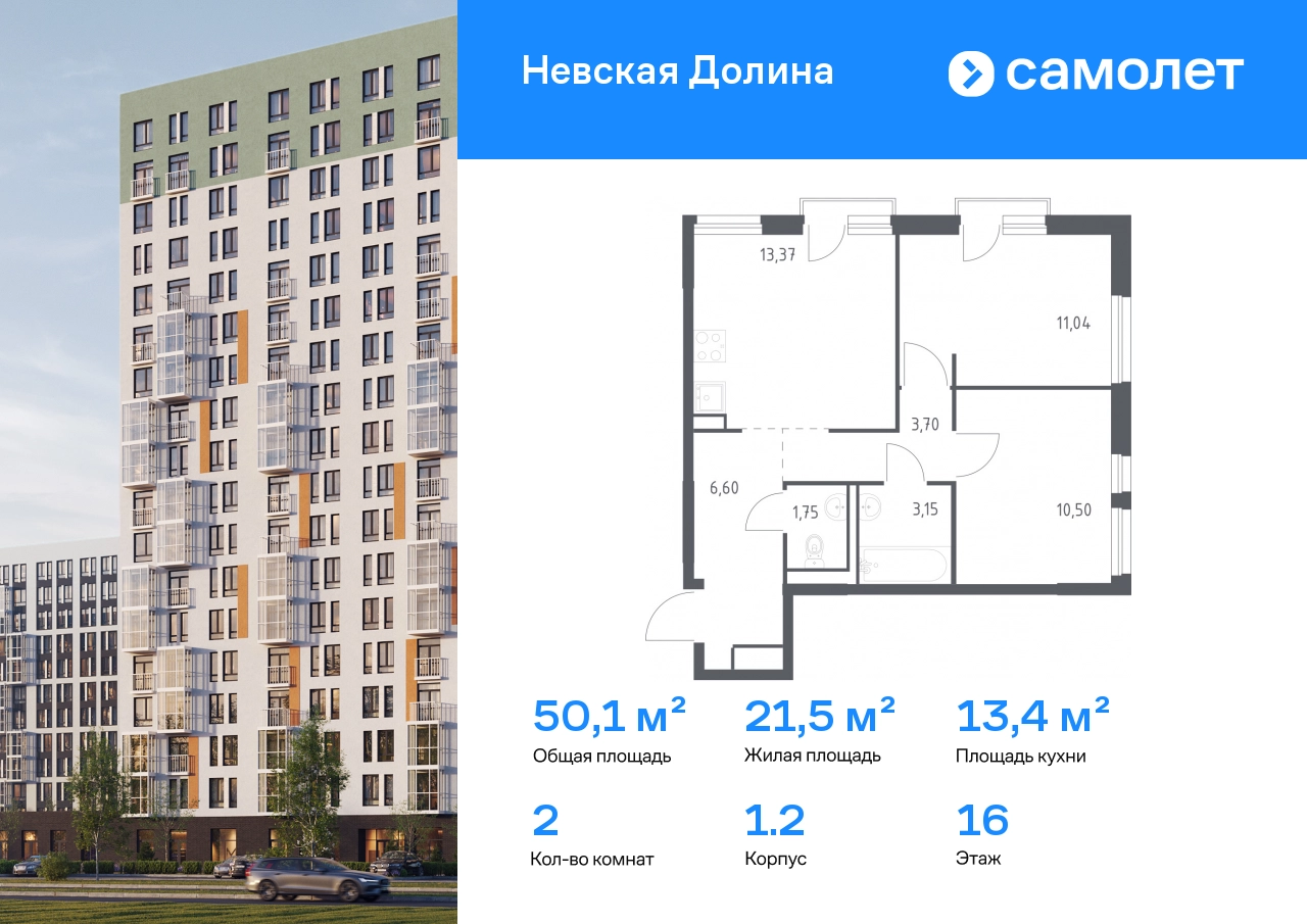 Строим кварталы для жизни с заботой о будущем. Предлагается 2-комнатная квартира комфорт-класса 50,11 кв.м в корпусе 1.2 на 16 этаже, в ЖК «Невская Долина» Квартира без отделки. Доступность опции «отделка» и возможность комплектации мебелью и декором уточняйте у застройщика. Приобрести квартиру возможно по специальным акциям от застройщика, с текущими условиями акций можно ознакомиться в блоке «Акций». Цена динамическая и может отличаться, уточняйте актуальность у застройщика. «Невская Долина» — зеленый холст для вашей жизни с уникальными палисадниками, садами и уютными уголками для отдыха. Всего в 5 минутах на машине — КАД, рядом — Большой Обуховский мост. До центра Петербурга — 35 минут на авто, до метро «Пролетарская» — 15 минут, до аэропорта Пулково — 30 минут. Комплекс находится на правом берегу Невы, рядом с Невским лесопарком, «МЕГА Парком» и парком развлечений. Скоро во дворе комплекса построят 4 детских сада и 2 школы. Рядом уже есть магазины «Дикси», «Магнит», пункты выдачи и аптеки. На первых этажах будут кафе и минимаркеты, откроется медицинский центр и физкультурно-оздоровительный комплекс. Архитектура домов сочетает в себе современность и функциональность — фасады украшены большими окнами, лоджиями, обычными и французскими балконами. В «Невской Долине» есть сады плодовых культур, игровые и спортивные зоны, 11 многоуровневых паркингов.#yan19-2r1822820#О застройщике
