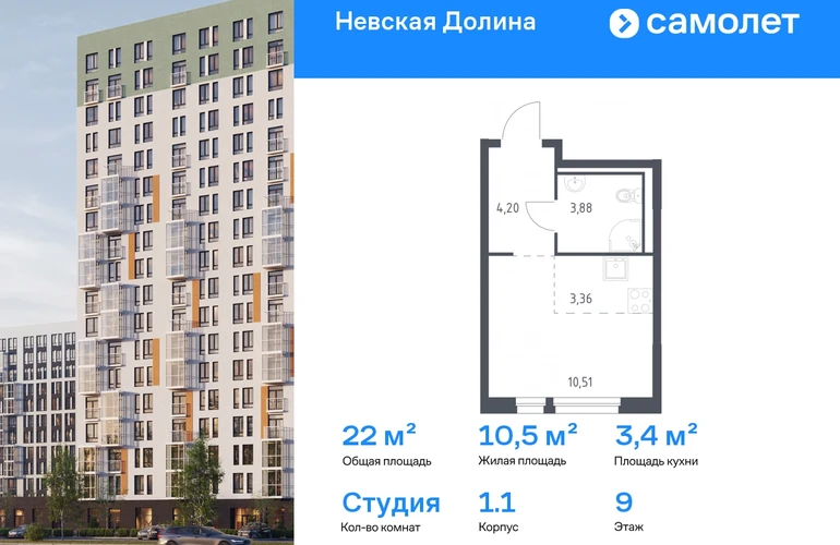Строим кварталы для жизни с заботой о будущем. Предлагается квартира студия комфорт-класса 21,95 кв.м в корпусе 1.1 на 9 этаже, в ЖК «Невская Долина» Квартира с чистовой отделкой. Доступность дополнительных опций уточняйте у застройщика. Приобрести квартиру возможно по специальным акциям от застройщика, с текущими условиями акций можно ознакомиться в блоке «Акций». Цена динамическая и может отличаться, уточняйте актуальность у застройщика. «Невская Долина» — зеленый холст для вашей жизни с уникальными палисадниками, садами и уютными уголками для отдыха. Всего в 5 минутах на машине — КАД, рядом — Большой Обуховский мост. До центра Петербурга — 35 минут на авто, до метро «Пролетарская» — 15 минут, до аэропорта Пулково — 30 минут. Комплекс находится на правом берегу Невы, рядом с Невским лесопарком, «МЕГА Парком» и парком развлечений. Скоро во дворе комплекса построят 4 детских сада и 2 школы. Рядом уже есть магазины «Дикси», «Магнит», пункты выдачи и аптеки. На первых этажах будут кафе и минимаркеты, откроется медицинский центр и физкультурно-оздоровительный комплекс. Архитектура домов сочетает в себе современность и функциональность — фасады украшены большими окнами, лоджиями, обычными и французскими балконами. В «Невской Долине» есть сады плодовых культур, игровые и спортивные зоны, 11 многоуровневых паркингов.#yan19-2r1822826#О застройщике