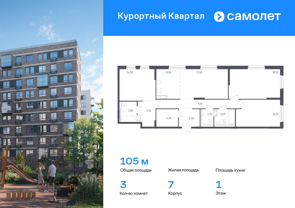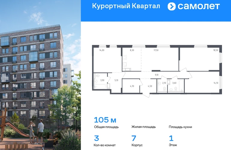 Строим кварталы для жизни с заботой о будущем. Предлагается 3-комнатная квартира комфорт-класса 105 кв.м в корпусе 7 на 1 этаже, в ЖК «Курортный Квартал» Квартира с предчистовой отделкой. Доступность дополнительных опций уточняйте у застройщика. Приобрести квартиру возможно по специальным акциям от застройщика, с текущими условиями акций можно ознакомиться в блоке «Акций». Цена динамическая и может отличаться, уточняйте актуальность у застройщика. Чтобы воплотить ваши мечты о жизни на курорте, мы построили проект комфорт-класса в 20 минутах от Финского залива. «Курортный Квартал» расположен в престижном районе поселка Песочный, всего в 25 минутах от центра Петербурга и 20 минутах до метро. На территории будет школа на 1100 мест с бассейном и детский сад на 110 мест. На первых этажах откроются кафе, магазины и пекарни. Рядом — спортивные секции и медицинские центры. В 3 минутах от дома — Курортный лесопарк для пикников и спорта на свежем воздухе. В выходные можно загорать на пляжах Финского залива или наблюдать за цаплями на Сестрорецком разливе. Корпуса высотой 7–10 этажей с фасадами в природных оттенках. Приватные дворы-парки без машин — с тренажерами и детскими площадками. Есть зеленый бульвар и сквер для отдыха. Предусмотрен открытый паркинг. В сквозных парадных — безбарьерная среда и помещения для хранения колясок. Все квартиры — с готовой отделкой, поэтому вам не придется тратить время и силы на ремонт. #yan19-2r1551172#О застройщике