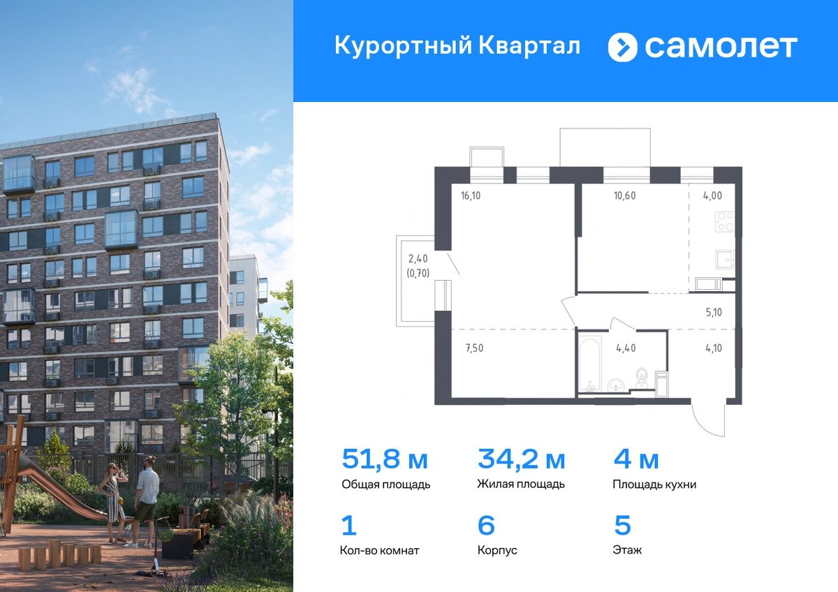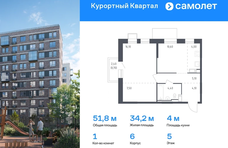 Строим кварталы для жизни с заботой о будущем. Предлагается 1-комнатная квартира комфорт-класса 51,8 кв.м в корпусе 6 на 5 этаже, в ЖК «Курортный Квартал» Квартира с чистовой отделкой. Доступность дополнительных опций уточняйте у застройщика. Приобрести квартиру возможно по специальным акциям от застройщика, с текущими условиями акций можно ознакомиться в блоке «Акций». Цена динамическая и может отличаться, уточняйте актуальность у застройщика. Чтобы воплотить ваши мечты о жизни на курорте, мы построили проект комфорт-класса в 20 минутах от Финского залива. «Курортный Квартал» расположен в престижном районе поселка Песочный, всего в 25 минутах от центра Петербурга и 20 минутах до метро. На территории будет школа на 1100 мест с бассейном и детский сад на 110 мест. На первых этажах откроются кафе, магазины и пекарни. Рядом — спортивные секции и медицинские центры. В 3 минутах от дома — Курортный лесопарк для пикников и спорта на свежем воздухе. В выходные можно загорать на пляжах Финского залива или наблюдать за цаплями на Сестрорецком разливе. Корпуса высотой 7–10 этажей с фасадами в природных оттенках. Приватные дворы-парки без машин — с тренажерами и детскими площадками. Есть зеленый бульвар и сквер для отдыха. Предусмотрен открытый паркинг. В сквозных парадных — безбарьерная среда и помещения для хранения колясок. Все квартиры — с готовой отделкой, поэтому вам не придется тратить время и силы на ремонт. #yan19-2r1786808#О застройщике