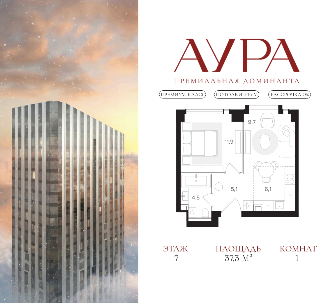1-комнатная квартира площадью 37,3 м2. Высота потолков – 3,16 м. Этаж 7 из 41.О проекте