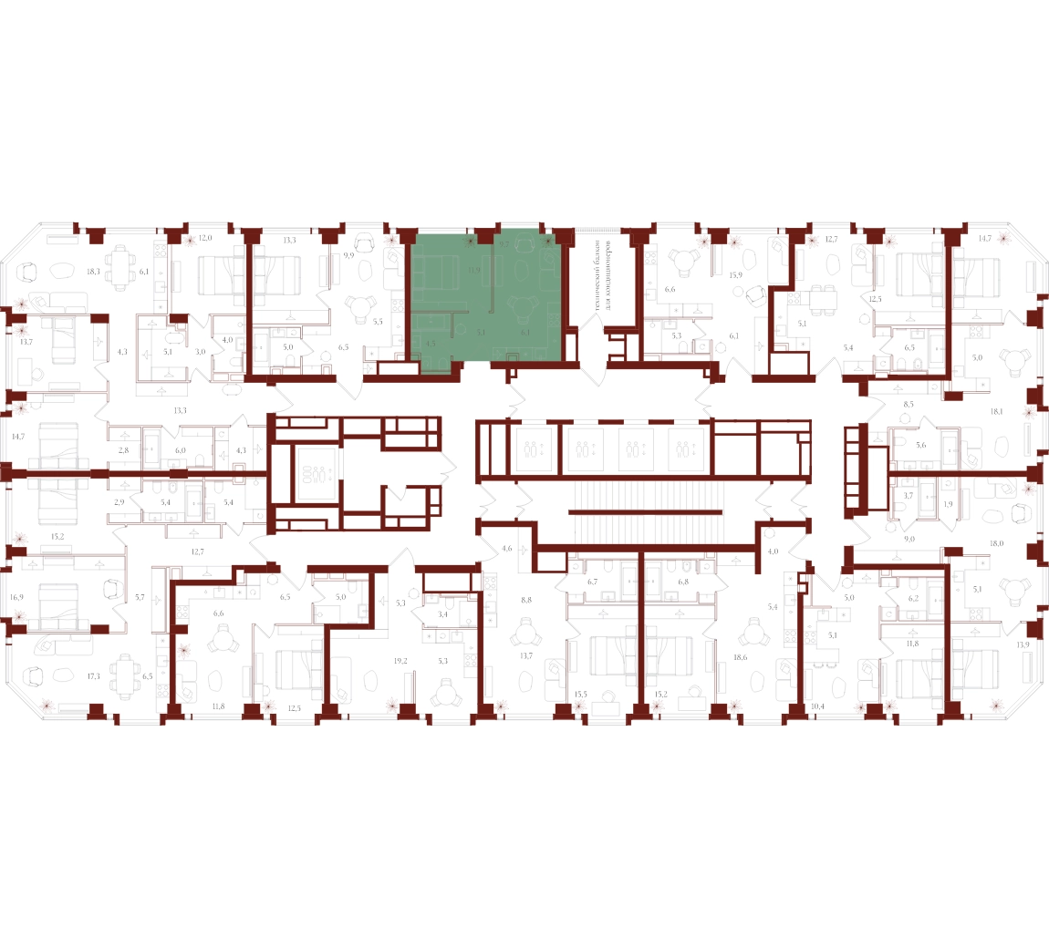 • Индивидуальная вентиляция квартир • Вентиляция с очисткой воздуха в общих зонах • Мультизональное центральное кондиционирование (VRF) • Горячая вода круглый год • Вода качества, сопоставимого с питьевой • Усиленная звукоизоляция квартир