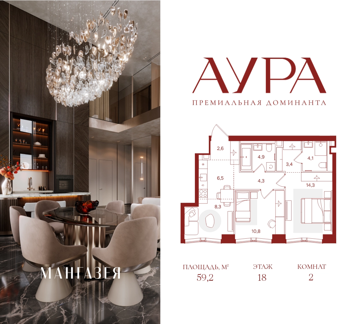 2-комнатная квартира площадью 59.20 м2. Высота потолков – 3.16 м. Этаж 18 из 42. Вид из окон - на город.О проекте АУРА новая премиальная доминанта Москвы в 10 минутах от Садового кольца. Проект состоит из 42-этажной Бронзовой башни и 41-этажной Серебряной. Рядом набережная Москвы-реки, Даниловский рынок, музеи и галереи, престижные школы и вузы.