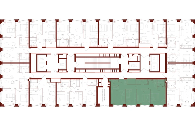 Только для резидентов: • Бьюти-комната • Коворкинг, переговорные и акустические кабинеты • Детская игровая комната • Спортзал и студия для тренировок • Просторные колясочные • Сервисная комната • Лапомойки для домашних питомцев