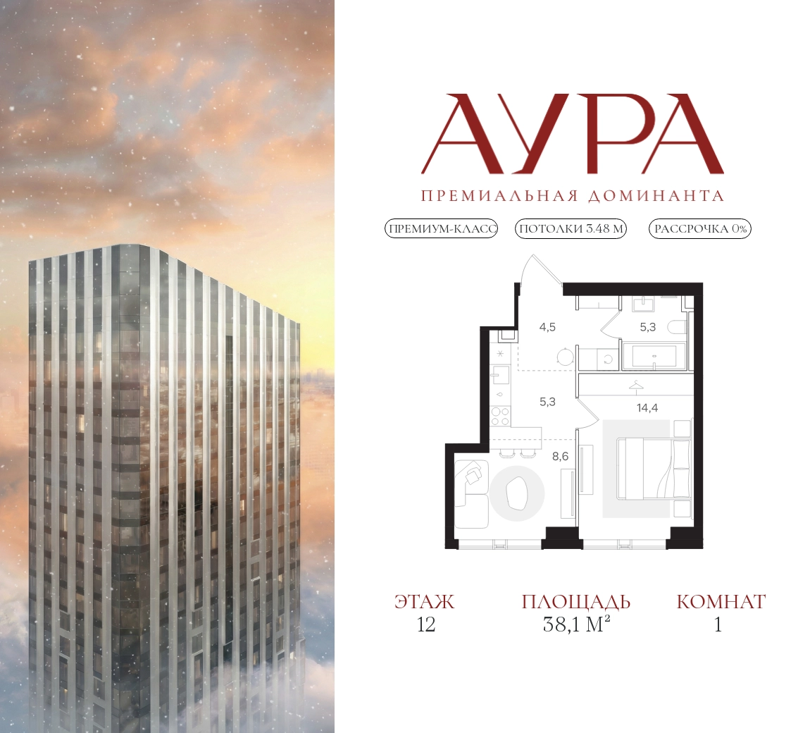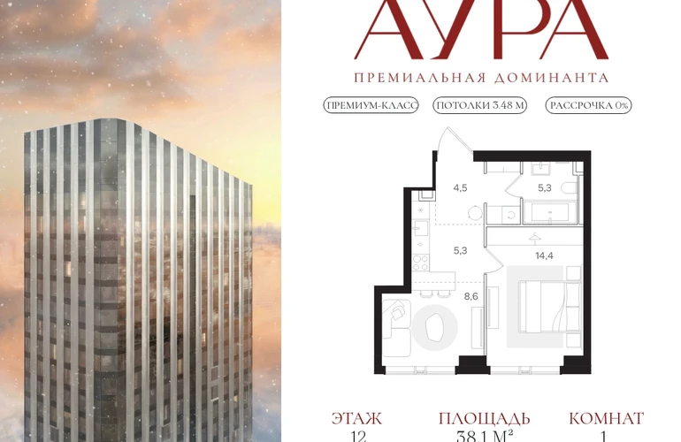 1-комнатная квартира площадью 38,1 м2. Высота потолков – 3,48 м. Этаж 12 из 42. Вид из окон - на город.О проекте