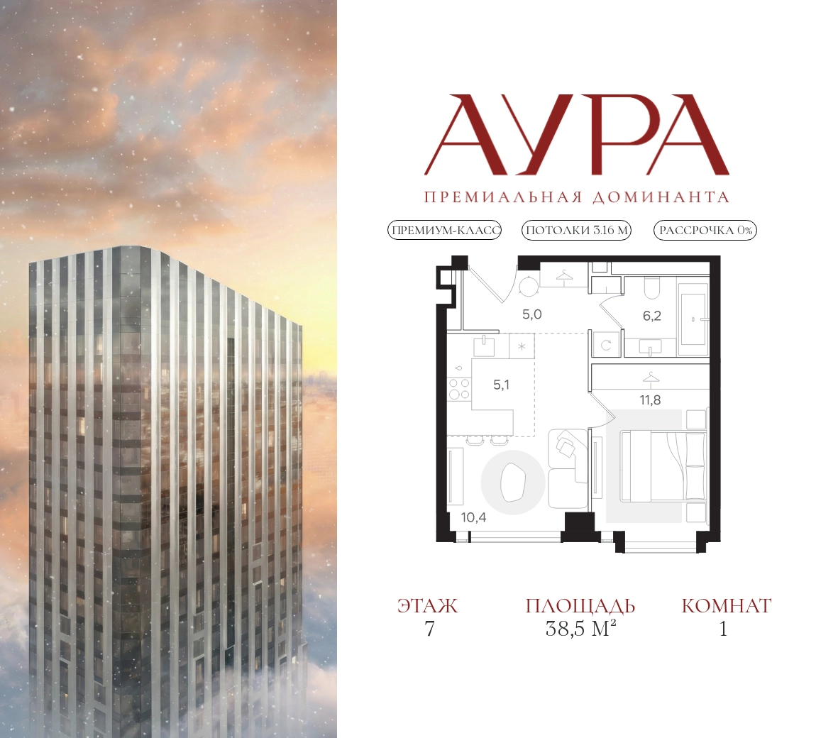 1-комнатная квартира площадью 38,5 м2. Высота потолков – 3,16 м. Этаж 7 из 41. Вид из окон - на город.О проекте