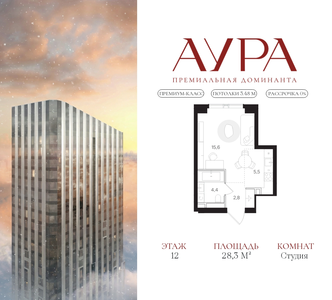 Студия площадью 28,3 м2. Высота потолков – 3,48 м. Этаж 12 из 42.О проекте