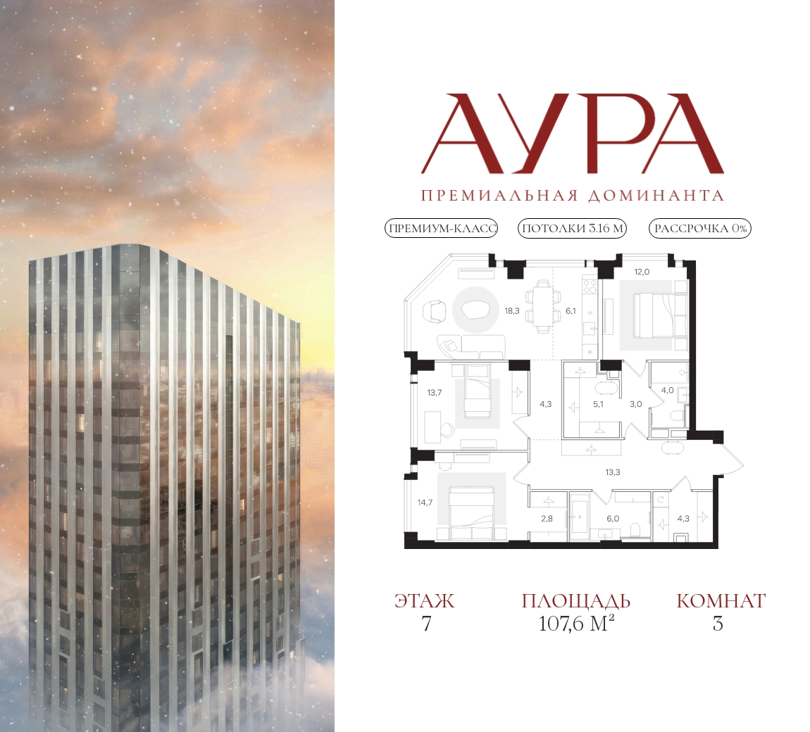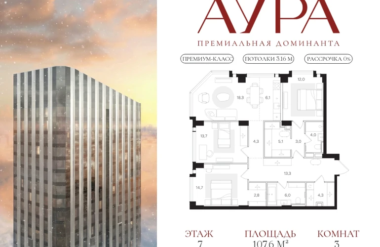 3-комнатная квартира площадью 107,6 м2. Высота потолков – 3,16 м. Этаж 7 из 41. Вид из окон - на две стороны света.О проекте