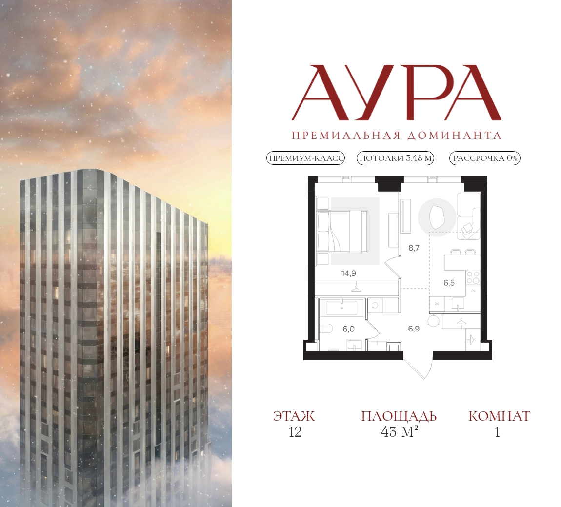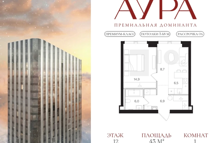 1-комнатная квартира площадью 43 м2. Высота потолков – 3,48 м. Этаж 12 из 42.О проекте