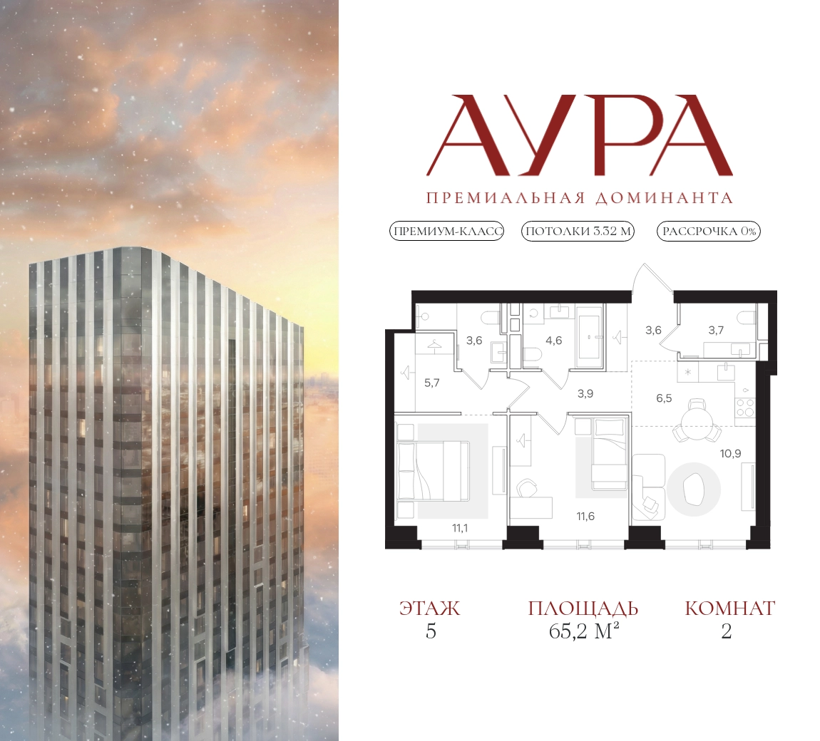 2-комнатная квартира площадью 65,2 м2. Высота потолков – 3,32 м. Этаж 5 из 42. Вид из окон - в свой двор.О проекте