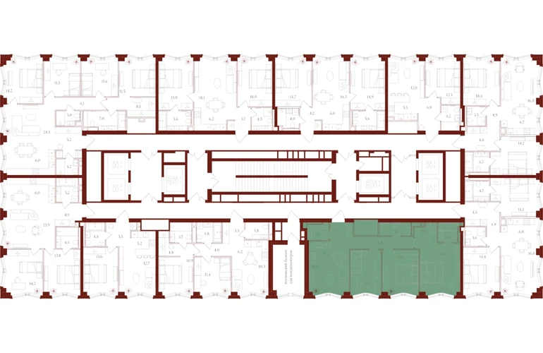 Только для резидентов: • Бьюти-комната • Коворкинг, переговорные и акустические кабинеты • Детская игровая комната • Спортзал и студия для тренировок • Просторные колясочные • Сервисная комната • Лапомойки для домашних питомцев