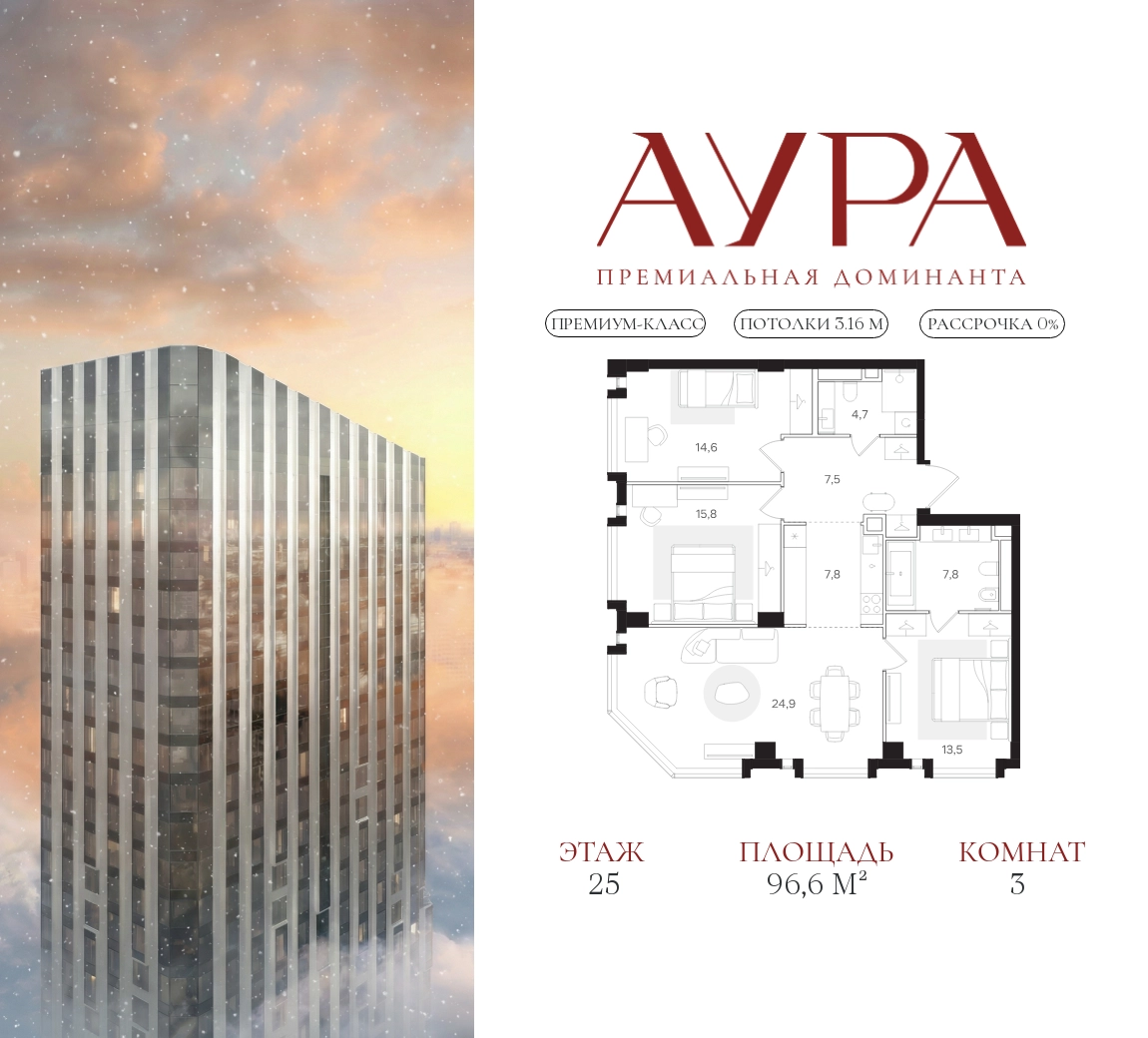 3-комнатная квартира площадью 96,6 м2. Высота потолков – 3,16 м. Этаж 25 из 41. Вид из окон - на две стороны света.О проекте