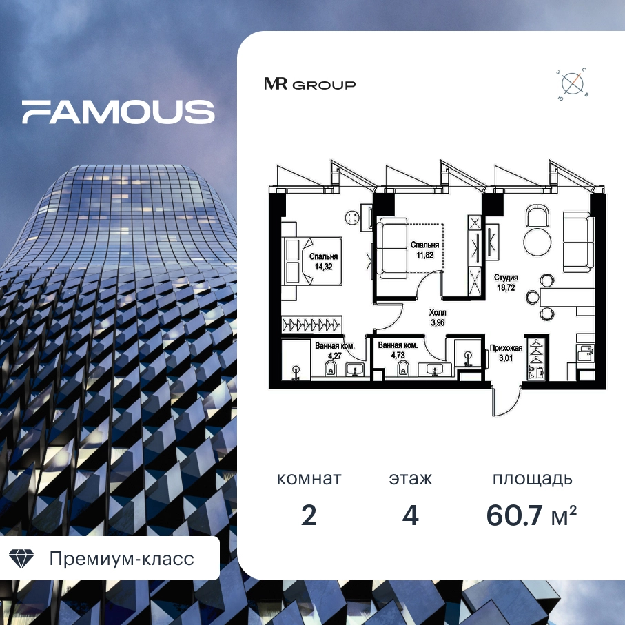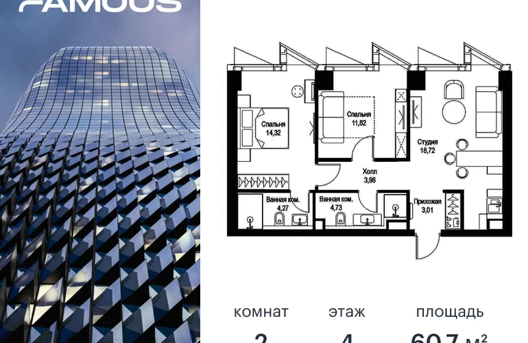 Прямая продажа от застройщика. Продаётся 2-к квартира общей площадью 60.20 кв. м с предчистовой отделкой на 4-м этаже премиального небоскреба Феймос. Срок ввода в эксплуатацию - IV кв. 2024 г. Выдача ключей - II кв. 2025 г. Если к слову «будущее» подобрать архитектурный синоним, им непременно станет премиальный небоскреб Феймос. Он расположен в закрытом квартале «Фили Сити» – настоящем городе в городе, окруженном зеленым ореолом из аллей и скверов, с инфраструктурой для жизни и отдыха самых взыскательных горожан. Резидентов Феймос ждет особая привилегия – открывающиеся из окон бескрайние панорамы, с видами на парк Фили, Поклонную гору, Москва-реку и Москва-Сити. Эффектный ультрасовременный 57-этажный небоскреб, пластичный в нижней части, наверху трансформируется и взмывает ввысь выразительной скульптурой с обтекаемой поверхностью. Фасад украшенный стеклянными эркерами в виде прямых треугольных призм, словно олицетворяет собой идеально собранный пазл. Это безупречное решение для тех, кто не боится лидерства и высоты, не ищет простых путей, держит высокую планку во всем, не останавливается на достигнутом и живет в ритме мегаполиса. Не зря логотип Феймос украшает графический элемент Триумфальной арки на Кутузовском проспекте – символ успеха и жизненных побед. Особенности дома: • Проект премиум-класса рядом с центром Москвы • Футуристическая авторская архитектура от бюро ADM • Ультрасовременные инженерные решения современных небоскрёбов • Элегантное решение орнаментальной композиции фасада от бюро ADM • Феймос станет первым проектом в Москве с интерьерами лобби от международной архитектурной компании A ++ • Панорамное остекление по всему фасаду, головокружительные виды на достопримечательности Москвы, парк Фили, Москва-Сити и Поклонную гору • Европейский подход к благоустройству: площадь с фонтанами, парк-променад, детские и спортивные площадки, зоны отдыха • Продуманная концепция инфраструктуры: уютные кафе и рестораны, супермаркет, фитнес-студия, службы сервиса, детский центр развития • Эргономичные планировки от бюро Олега Клодта Транспортная доступность: • Удобный выезд на Кутузовский проспект и ТТК • В пешей доступности станции метро «Фили», «Багратионовская» и «Парк Победы» Компания MR Group предлагает своим клиентам специальные условия приобретения квартир в рамках программ ипотечного кредитования от банков-партнеров.О застройщике