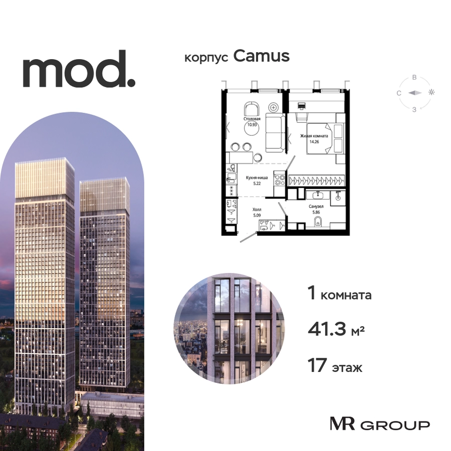 Прямая продажа от застройщика. Жилой комплекс премиум-класса Mod. Продается 1-к квартира общей площадью 41.40 кв. м с предчистовой отделкой в ЖК Mod на 17-м этаже 44 этажного дома. Mod - жилой комплекс премиум-класса в историческом районе Москвы Марьина Роща. Пятый корпус станет частью единого высотного ансамбля, который поднимается над столицей и очерчивает новый горизонт города. Расположение корпуса Mod.C отличается тем, что виды на юго-запад Москвы не ограничены существующей застройкой. Почти все главные доминанты столицы — как на ладони: от сталинских высоток до небоскрёбов делового центра. Любоваться достопримечательностями будет вдвойне приятнее через панорамные окна. Закрытая территория жилого комплекса, продуманное благоустройство, эксплуатируемые кровли стилобата, образовательный центр с детским садом создают приватное пространство для тихой семейной жизни, а городская площадь с фонтанами, ресторан, супермаркет, коммерческая инфраструктура на первых этажах привносят созвучную с ритмом города динамику. Преимущества проекта: • В шаговой доступности новый деловой кластер Москвы • Выразительная авторская архитектура • Единственные в Москве фасады башен из натурального камня • Панорамное остекление и высота потолков до 4,8 м • Квартиры и апартаменты с отделкой MR Base • Многоуровневое благоустройство с зонированием на закрытой территории • Многофункциональный образовательный детский центр с детским садом • Двухуровневый подземный паркинг Транспортная доступность: • 5 минут пешком до станции метро «Марьина роща» • 3 минуты до ТТК • 15 минут до Цветного бульвара Компания MR Group предлагает своим клиентам специальные условия приобретения квартир в рамках программ ипотечного кредитования от банков-партнеров.О застройщике