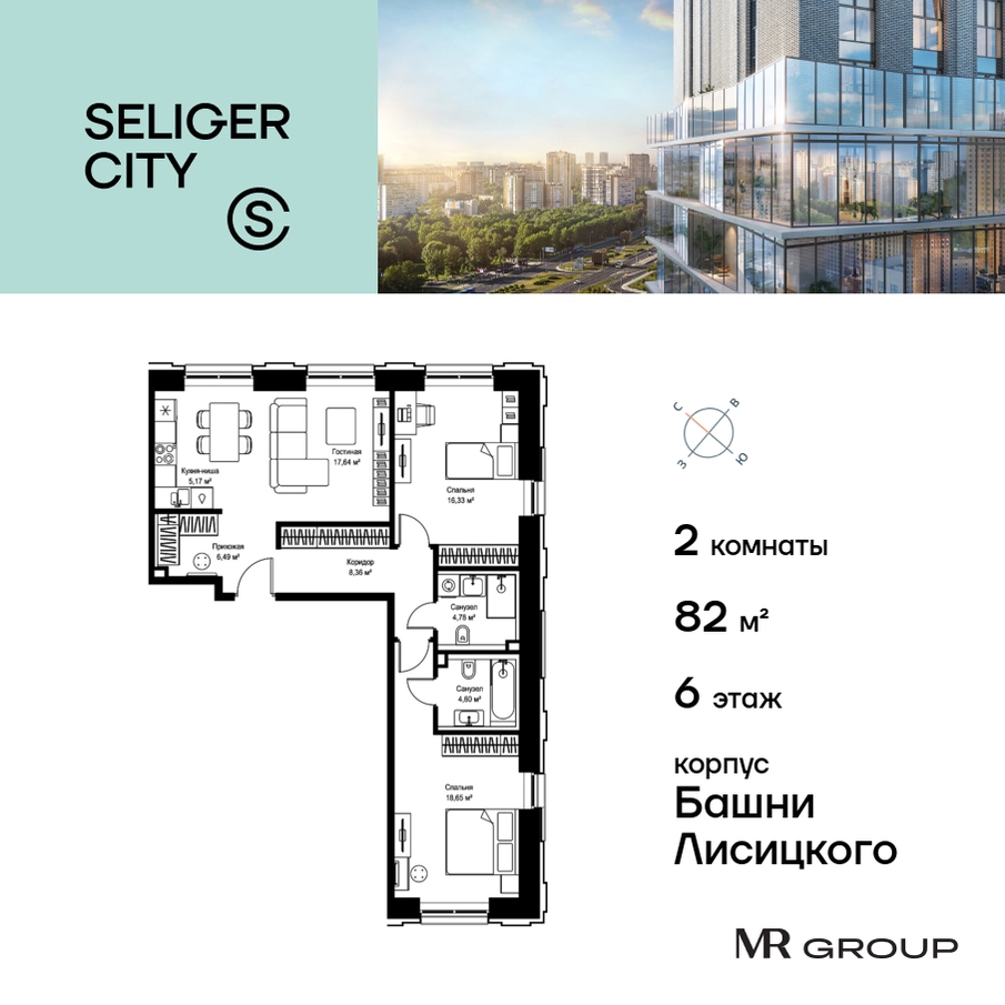 Прямая продажа от застройщика. Продаётся 2-к квартира общей площадью 82.02 кв. м с предчистовой отделкой в ЖК «Селигер Сити» на 6-м этаже башни Лисицкого. Корпуса четвертой очереди ЖК «Селигер сити» названы в честь трех великих представителей науки и архитектуры, новаторское видение которых — слишком смелое для своего времени — нашло воплощение в уникальных домах жилого комплекса. Вдохновленные авангардными идеями знаменитого советского архитектора Эля Лисицкого, архитекторы создали яркий центр притяжения всего района, задающий новый стандарт жизни в современном мегаполисе — две высокие «Башни Лисицкого» с современной интерпретацией горизонтального небоскреба. Преимущества проекта: Первые три очереди сданы. • 2 минуты пешком от метро «Селигерская» • Архитектурное решение от голландского бюро MLA + • 8 корпусов разной этажности от 8 до 45 этажей • Одна из самых больших придомовых территорий в Москве — размером с 4 футбольных поля • Огороженная охраняемая территория, круглосуточное видеонаблюдение • Европейский подход к благоустройству от бюро WOWHaus: детские площадки для разных возрастов, спортивные площадки, площадки воркаута, дорожки для бега и пеших прогулок, скейтпарк, хоккейная площадка, площадка для выгула собак • Искусственный пруд на территории комплекса с благоустроенной набережной и мостом • Продуманная концепция инфраструктуры: уютные кафе и рестораны, супермаркет, магазин фермерских продуктов, бытовые службы, салон красоты, детские сады • Панорамные окна высотой до 2,5 м, в корпусах 3 очереди витражное остекление высотой до 4,2 м • Широкий выбор квартир — от компактных студий до просторных квартир с тремя спальнями и пентхаусов • Четыре вида дизайнерской отделки квартир от бюро Вlank Architects • Возможность купить квартиру с предчистовой отделкой white box • «Умный дом» на платформе Ujin. Система безопасности, вход на территорию и в подъезд по биометрии или BLE-метке, въезд в паркинг по считывателю номера, контроль климата. Все для комфортной жизни! • Лобби по индивидуальному дизайн проекту от европейского бюро Вlank Architects: лаунж-зоны, ресепшен, колясочная, помещение для мытья лап животным после прогулки • Подземный паркинг на 2189 машино-мест по индивидуальному дизайну, с зарядными устройствами для электромобилей, постами для подкачки шин и келлерами • Надежный девелопер с опытом премиальных проектов MR Group Расположение комплекса: • 2 минуты от станции метро «Селигерская» • 7 минут на машине до станции метро «Окружная» • Предусмотрен удобный выезд в сторону ТТК (всего 9 км или 15 минут без пробок) • МКАД в 10 минутах на машине Компания MR Group предлагает своим клиентам специальные условия приобретения квартир в рамках программ ипотечного кредитования от банков-партнеров.О застройщике