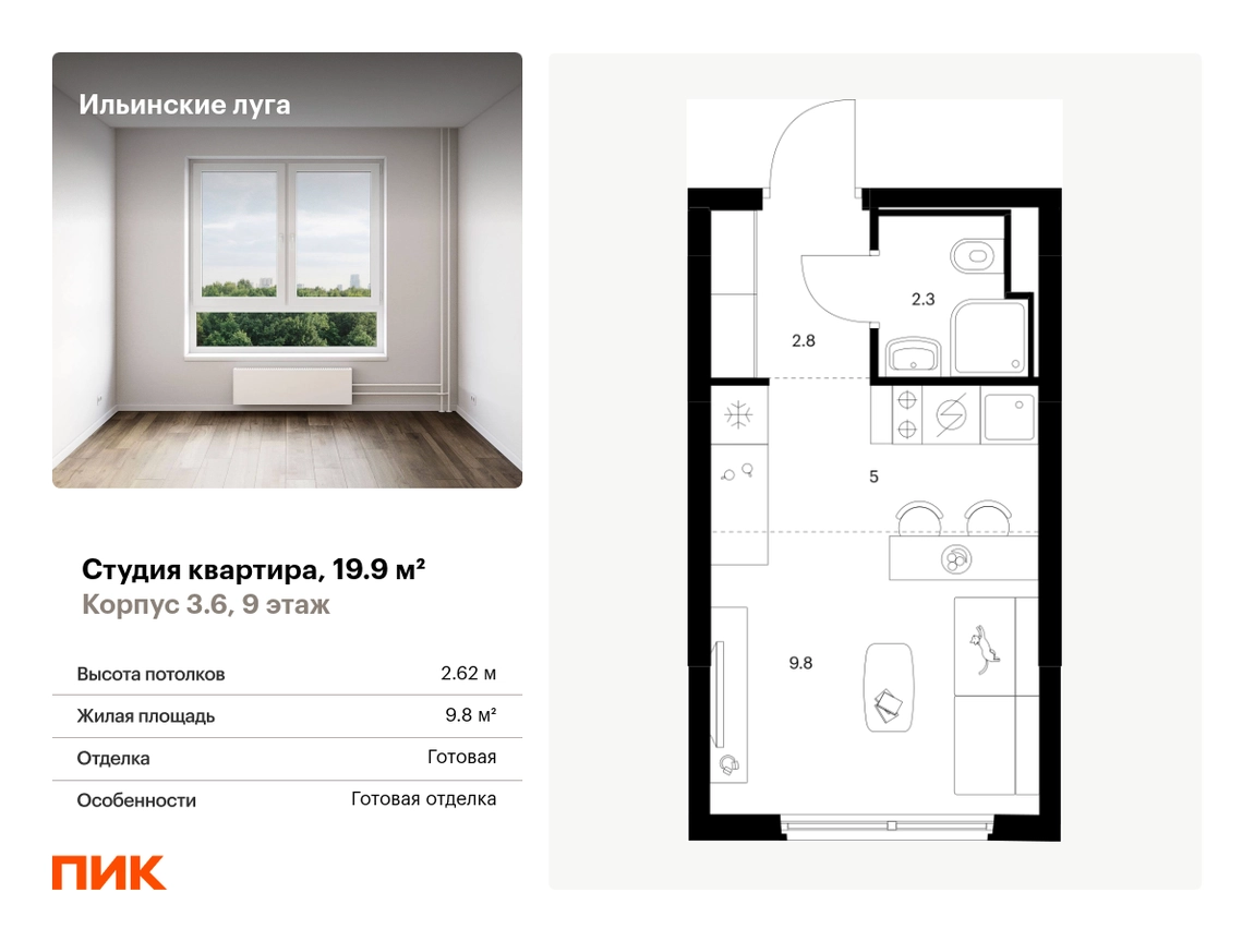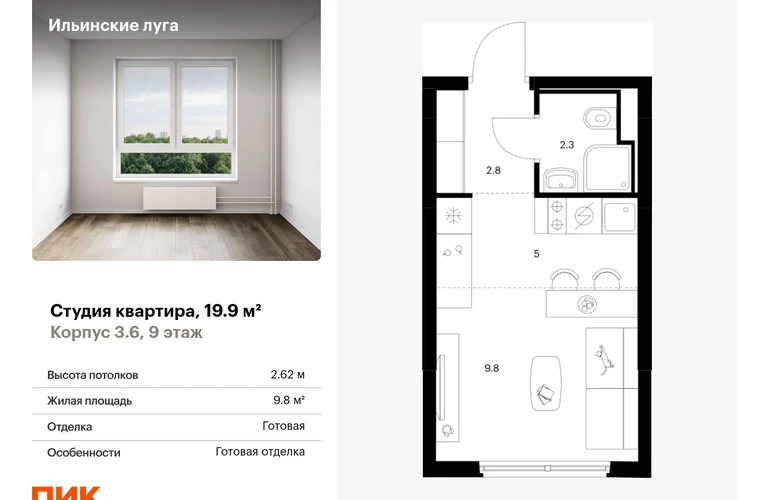 В Красногорске Московской области продаётся студия квартира площадью 19.9 на 9 этаже 9 этажного дома (корпус 3.6, секция 2) в проекте ПИК «Ильинские луга». Удобное расположение 20 минут на автомобиле до станций метро «Волоколамская», «Тушинская» и «Строгино». 20 минут на машине до МЦД «Павшино». 5 минут на автомобиле до ТЦ «РИГАМОЛЛ» и 10 минут до ТЦ «Твой дом» и гипермаркета «Глобус». 10 минут на автомобиле до музея-заповедника Архангельское. Особенности проекта «Ильинские луга» — масштабный проект с собственной инфраструктурой и атмосферой загородной жизни. Удобные и разнообразные планировки позволят каждому выбрать квартиру под собственный сценарий жизни. Преимущества проекта: Отделка: Готовая Особенности планировки: Окна в пол Светлые и просторные холлы с быстрыми тихими лифтами. Девять детских садов, четыре школы и современная поликлиника на территории проекта. Дворы-парки с местами для отдыха, детскими и спортивными площадками. Пешеходный бульвар для прогулок и отдыха. PlayHub «Гравити» — большая игровая площадка для детей. Магазины, кафе и полезные сервисы на первых этажах домов. Наземный паркинг с зарядными станциями для электрокаров. АртикулО застройщике