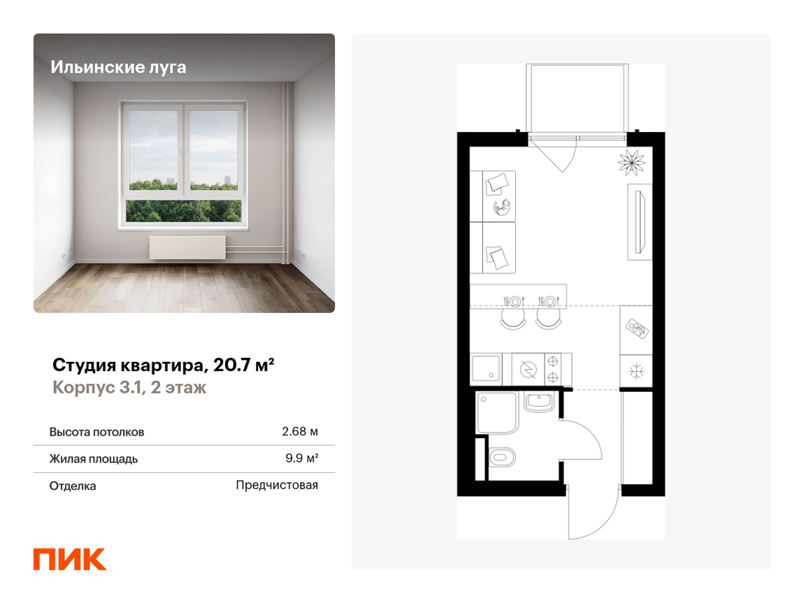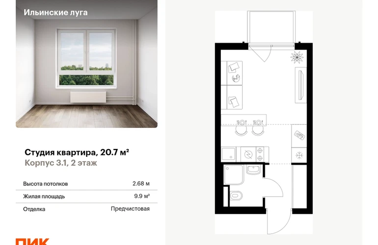 В Красногорске Московской области продаётся студия квартира площадью 20.7 на 2 этаже 9 этажного дома (корпус 3.1, секция 4) в проекте ПИК «Ильинские луга». Удобное расположение 20 минут на автомобиле до станций метро «Волоколамская», «Тушинская» и «Строгино». 20 минут на машине до МЦД «Павшино». 5 минут на автомобиле до ТЦ «РИГАМОЛЛ» и 10 минут до ТЦ «Твой дом» и гипермаркета «Глобус». 10 минут на автомобиле до музея-заповедника Архангельское. Особенности проекта «Ильинские луга» — масштабный проект с собственной инфраструктурой и атмосферой загородной жизни. Удобные и разнообразные планировки позволят каждому выбрать квартиру под собственный сценарий жизни. Преимущества проекта: Отделка: Предчистовая Особенности планировки: Открытый балкон Светлые и просторные холлы с быстрыми тихими лифтами. Девять детских садов, четыре школы и современная поликлиника на территории проекта. Дворы-парки с местами для отдыха, детскими и спортивными площадками. Пешеходный бульвар для прогулок и отдыха. ПлейХаб «Гравити» — большая игровая площадка для детей. Магазины, кафе и полезные сервисы на первых этажах домов. Наземный паркинг с зарядными станциями для электрокаров. АртикулО застройщике