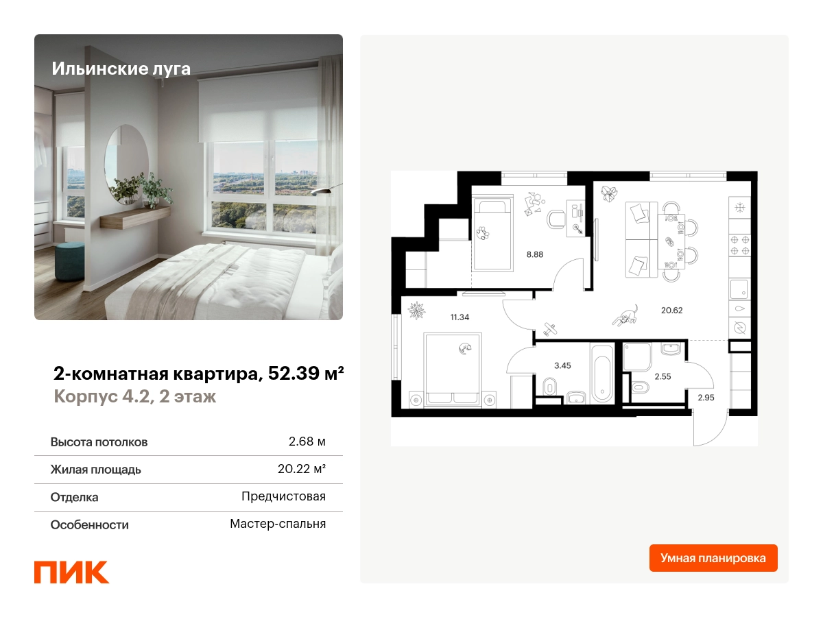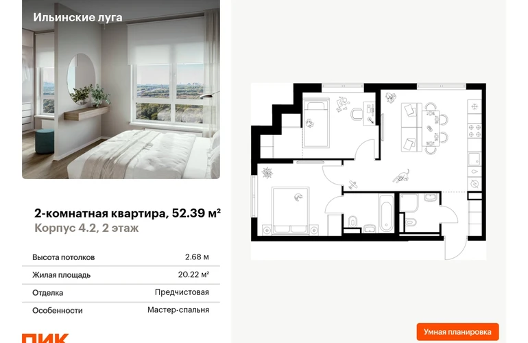 В Красногорске Московской области продаётся 2-комнатная квартира квартира площадью 52.39 на 2 этаже 9 этажного дома (корпус 4.2, секция 3) в проекте ПИК «Ильинские луга». Удобное расположение 20 минут на автомобиле до станций метро «Волоколамская», «Тушинская» и «Строгино». 20 минут на машине до МЦД «Павшино». 5 минут на автомобиле до ТЦ «РИГАМОЛЛ» и 10 минут до ТЦ «Твой дом» и гипермаркета «Глобус». 10 минут на автомобиле до музея-заповедника Архангельское. Особенности проекта «Ильинские луга» — масштабный проект с собственной инфраструктурой и атмосферой загородной жизни. Удобные и разнообразные планировки позволят каждому выбрать квартиру под собственный сценарий жизни. Преимущества проекта: Отделка: Предчистовая Особенности планировки: Гардеробная, Мастер-спальня, Кухня-гостиная, Два и более санузла, Умная планировка Светлые и просторные холлы с быстрыми тихими лифтами. Девять детских садов, четыре школы и современная поликлиника на территории проекта. Дворы-парки с местами для отдыха, детскими и спортивными площадками. Пешеходный бульвар для прогулок и отдыха. ПлейХаб «Гравити» — большая игровая площадка для детей. Магазины, кафе и полезные сервисы на первых этажах домов. Наземный паркинг с зарядными станциями для электрокаров. АртикулО застройщике