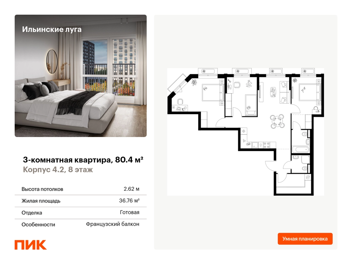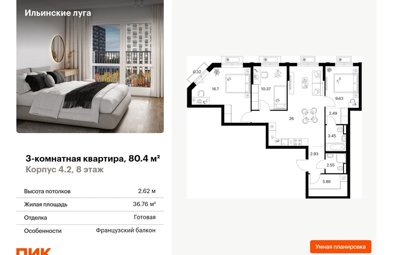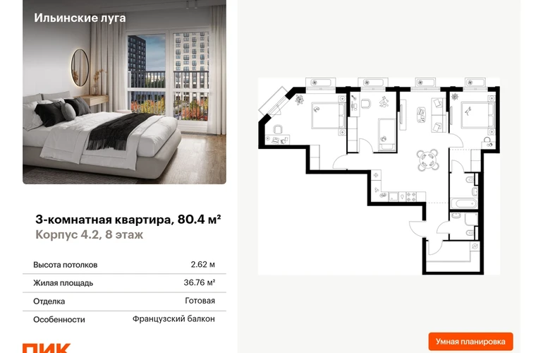 В Красногорске Московской области продаётся 3-комнатная квартира квартира площадью 80.4 на 8 этаже 9 этажного дома (корпус 4.2, секция 2) в проекте ПИК «Ильинские луга». Удобное расположение 20 минут на автомобиле до станций метро «Волоколамская», «Тушинская» и «Строгино». 20 минут на машине до МЦД «Павшино». 5 минут на автомобиле до ТЦ «РИГАМОЛЛ» и 10 минут до ТЦ «Твой дом» и гипермаркета «Глобус». 10 минут на автомобиле до музея-заповедника Архангельское. Особенности проекта «Ильинские луга» — масштабный проект с собственной инфраструктурой и атмосферой загородной жизни. Удобные и разнообразные планировки позволят каждому выбрать квартиру под собственный сценарий жизни. Преимущества проекта: Отделка: Готовая Особенности планировки: Гардеробная, Мастер-спальня, Разнесенные спальни, Кухня-гостиная, Два и более санузла, Французский балкон, Умная планировка Светлые и просторные холлы с быстрыми тихими лифтами. Девять детских садов, четыре школы и современная поликлиника на территории проекта. Дворы-парки с местами для отдыха, детскими и спортивными площадками. Пешеходный бульвар для прогулок и отдыха. ПлейХаб «Гравити» — большая игровая площадка для детей. Магазины, кафе и полезные сервисы на первых этажах домов. Наземный паркинг с зарядными станциями для электрокаров. АртикулО застройщике