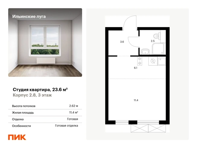 Продаётся квартира-студия площадью 23.60 кв.м на 3 этаже 9 этажного дома (Корпус 2.8, секция 2) проекта ПИК Ильинские луга. Светлый просторный подъезд на уровне земли, функциональная планировка, большие окна, с отделкой. <br> <br>Жилой район «Ильинские луга» находится в 10 километрах от МКАД по Новорижскому шоссе, в 20 минутах на автомобиле от станций метро «Волоколамская», «Тушинская» и «Строгино». В будущем ближе к проекту, в 9 минутах пути на машине, откроется станция «Ильинская» Рублёво-Архангельской линии, которая будет соединять Арбатско-Покровскую линию и Большую кольцевую линию. <br> <br>«Ильинские луга» — масштабный проект, в который входит девять детских садов, четыре школы и поликлиника. Он строится в престижном и экологичном районе среди лесов и памятников природы. За 5 минут от жилого квартала можно доехать до Рублёво-Успенского шоссе, а за 30 минут — до центра Москвы. До крупного торгового центра «РИГАМОЛЛ» всего 5 минут на автомобиле, а до ТЦ «Твой дом» и гипермаркета «Глобус» — 10 минут. <br> <br>В «Ильинских лугах» строятся только девятиэтажные дома — такая архитектура соответствует спокойной жизни за городом. В каждом дворе-парке есть места для отдыха, детские и спортивные площадки. А ещё, здесь уже открыт большой PlayHub «Гравити» — современное игровое пространство с космической тематикой, холмами, зонами для игр и отдыха жителей любого возраста. <br> <br>На первых этажах уже работают магазины, кафе и пекарни. <br> <br>Места для отдыха от «Ильинских лугов» тоже недалеко: 10 минут на машине — и вы в музее-усадьбе «Архангельское». Также рядом находится Лохин остров — памятник природы, где водятся речные черепахи, есть места для кемпинга и возможность сплавиться по реке. Артикул - 942623О застройщике