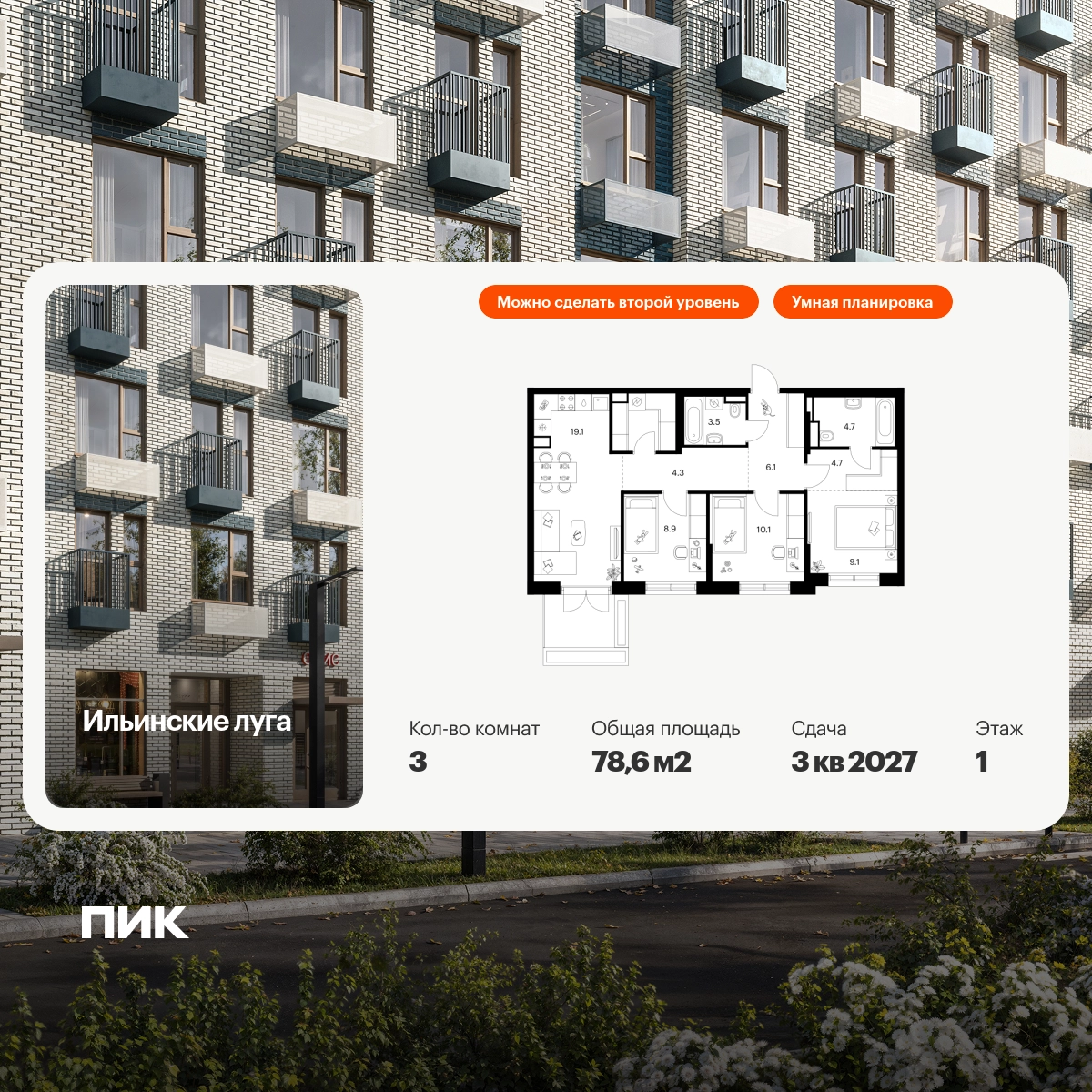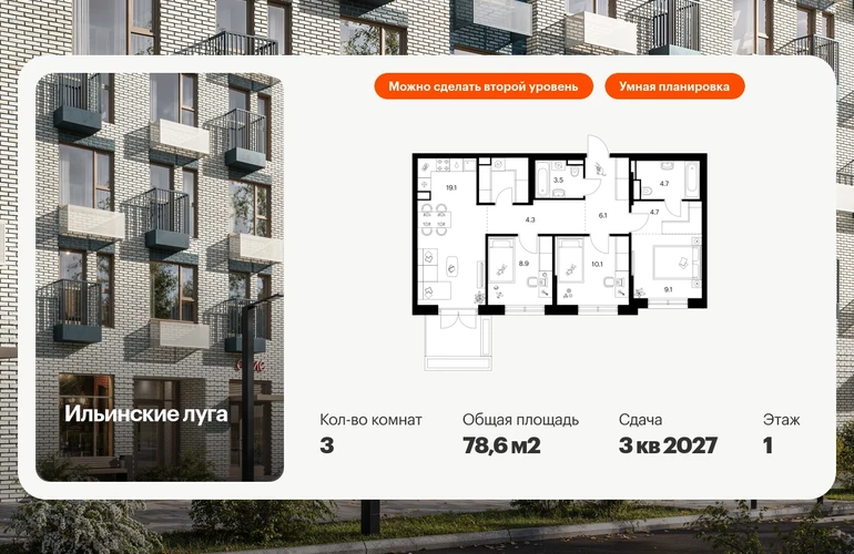 Продаётся 3-комн.квартира площадью 78.60 кв.м на 1 этаже 9 этажного дома (Корпус 4.3, секция 2) проекта ПИК Ильинские луга. Светлый просторный подъезд на уровне земли, функциональная планировка, большие окна, с отделкой. «Ильинские луга» — масштабный проект с собственной инфраструктурой в 10 километрах от МКАД по Новорижскому шоссе. Квартал возводится в экологичном районе, рядом с музеем-усадьбой «Архангельское» и живописным Лохиным островом — памятником природы с речными черепахами, кемпингом и сплавами по реке. В 20 минутах пути на автомобиле от проекта расположены три станции метро — «Волоколамская», «Тушинская» и «Строгино», а также МЦД «Павшино». Уже в 2028 году в 9 минутах пути на машине откроется новая станция «Ильинская» на Рублёво-Архангельской линии. До крупного торгового центра «Ригамолл» всего 5 минут на автомобиле, а до ТЦ «Твой дом» и гипермаркета «Глобус» — 10 минут. Архитектура и лобби В проекте только 9-этажные дома, окружённые живописными локациями и природными памятниками, — всё это создаёт атмосферу спокойной загородной жизни. Первые этажи домов — просторные и светлые, с быстрыми и тихими лифтами. Благодаря стеклянным дверям в подъезды попадает много солнечного света. У подъездов два выхода: на улицу и во двор — не придётся обходить дом, если оставили машину на парковке, а дети будут выходить гулять, минуя проезжую часть. Инфраструктура проекта На территории квартала будет вся необходимая инфраструктура. В проекте 9 детских садов, два из которых уже работают, 4 школы, одна из которых уже открыта, и современная поликлиника. Через квартал протянется широкий пешеходный бульвар для прогулок и отдыха. Уже открыт PlayHub «Гравити» — большая игровая площадка для детей разного возраста с лазательным комплексом, песочной станцией и зонами отдыха для родителей. На первых этажах домов работают магазины, кафе и полезные сервисы. А на парковке установлены зарядные станции для электрокаров. В квартирах продуман каждый метр — мы детально просчитываем все возможные сценарии и способы использовать пространство. Например, большой семье подойдёт квартира с кухней-гостиной, выделенной постирочной и спальнями, разнесёнными по разные стороны гостиной. А кому-то важнее просторная мастер-спальня с гардеробной и собственным санузлом. Для ценителей простора и обилия солнечного света мы предусмотрели квартиры с окнами в пол, террасами, а также французскими, фигурными и открытыми классическими балконами. Артикул - 1011857О застройщике