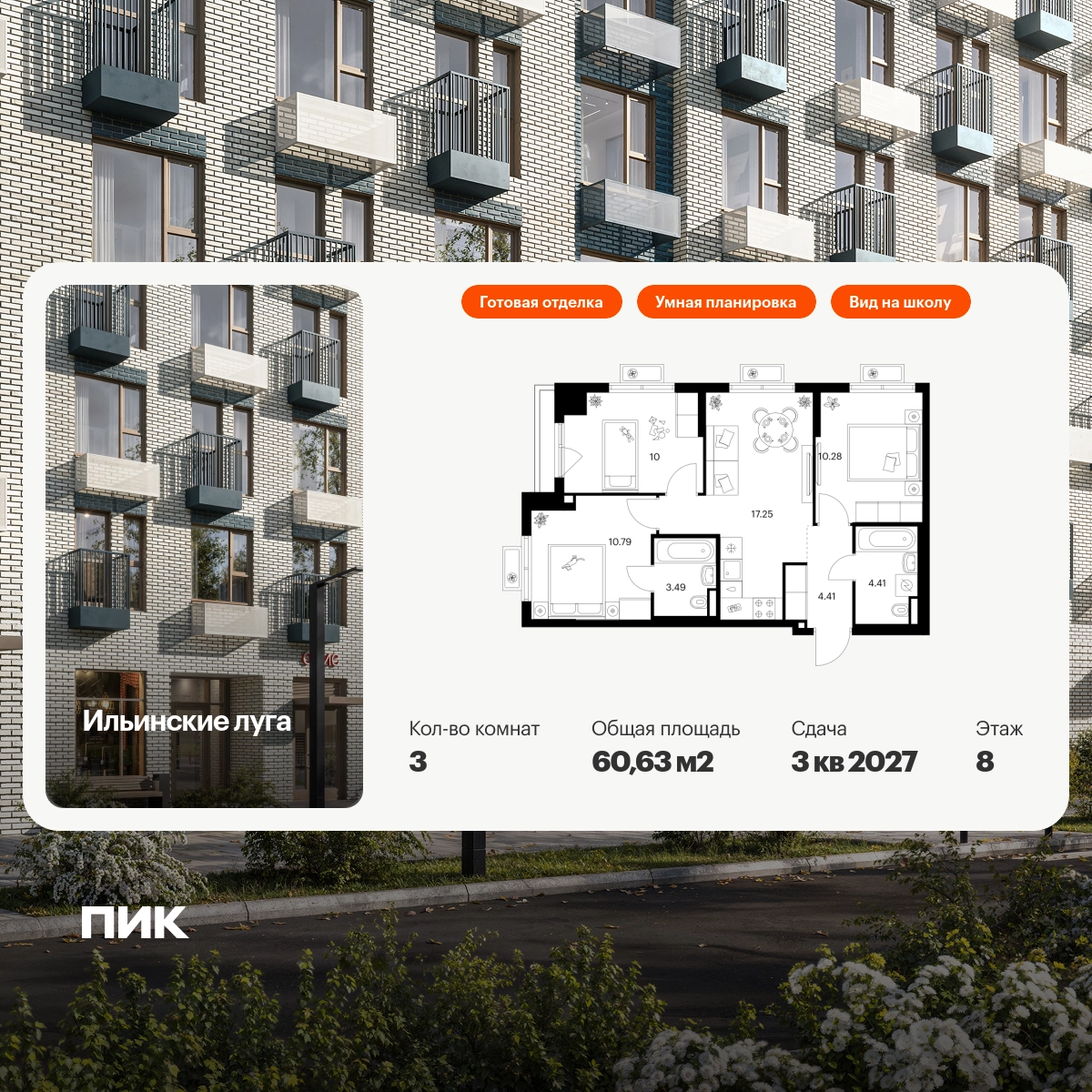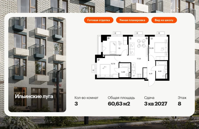 В Красногорске Московской области продаётся 3-комнатная квартира квартира площадью 60.63 на 8 этаже 9 этажного дома (корпус 4.1, секция 5) в проекте ПИК «Ильинские луга». Удобное расположение 20 минут на автомобиле до станций метро «Волоколамская», «Тушинская» и «Строгино». 20 минут на машине до МЦД «Павшино». 5 минут на автомобиле до ТЦ «РИГАМОЛЛ» и 10 минут до ТЦ «Твой дом» и гипермаркета «Глобус». 10 минут на автомобиле до музея-заповедника Архангельское. Особенности проекта «Ильинские луга» — масштабный проект с собственной инфраструктурой и атмосферой загородной жизни. Удобные и разнообразные планировки позволят каждому выбрать квартиру под собственный сценарий жизни. Преимущества проекта: Отделка: Готовая Особенности планировки: Мастер-спальня, Кухня-гостиная, Два и более санузла, Французский балкон, Умная планировка Светлые и просторные холлы с быстрыми тихими лифтами. Девять детских садов, четыре школы и современная поликлиника на территории проекта. Дворы-парки с местами для отдыха, детскими и спортивными площадками. Пешеходный бульвар для прогулок и отдыха. ПлейХаб «Гравити» — большая игровая площадка для детей. Магазины, кафе и полезные сервисы на первых этажах домов. Наземный паркинг с зарядными станциями для электрокаров. АртикулО застройщике