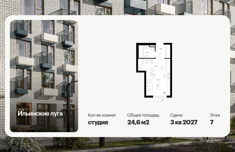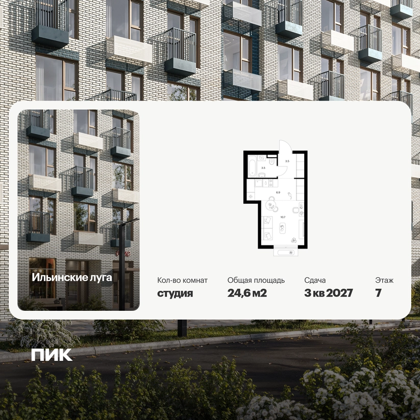 Продаётся квартира-студия площадью 24.60 кв.м на 7 этаже 9 этажного дома (Корпус 4.3, секция 2) проекта ПИК Ильинские луга. Светлый просторный подъезд на уровне земли, функциональная планировка, большие окна, с отделкой. «Ильинские луга» — масштабный проект с собственной инфраструктурой в 10 километрах от МКАД по Новорижскому шоссе. Квартал возводится в экологичном районе, рядом с музеем-усадьбой «Архангельское» и живописным Лохиным островом — памятником природы с речными черепахами, кемпингом и сплавами по реке. В 20 минутах пути на автомобиле от проекта расположены три станции метро — «Волоколамская», «Тушинская» и «Строгино», а также МЦД «Павшино». Уже в 2028 году в 9 минутах пути на машине откроется новая станция «Ильинская» на Рублёво-Архангельской линии. До крупного торгового центра «Ригамолл» всего 5 минут на автомобиле, а до ТЦ «Твой дом» и гипермаркета «Глобус» — 10 минут. Архитектура и лобби В проекте только 9-этажные дома, окружённые живописными локациями и природными памятниками, — всё это создаёт атмосферу спокойной загородной жизни. Первые этажи домов — просторные и светлые, с быстрыми и тихими лифтами. Благодаря стеклянным дверям в подъезды попадает много солнечного света. У подъездов два выхода: на улицу и во двор — не придётся обходить дом, если оставили машину на парковке, а дети будут выходить гулять, минуя проезжую часть. Инфраструктура проекта На территории квартала будет вся необходимая инфраструктура. В проекте 9 детских садов, два из которых уже работают, 4 школы, одна из которых уже открыта, и современная поликлиника. Через квартал протянется широкий пешеходный бульвар для прогулок и отдыха. Уже открыт PlayHub «Гравити» — большая игровая площадка для детей разного возраста с лазательным комплексом, песочной станцией и зонами отдыха для родителей. На первых этажах домов работают магазины, кафе и полезные сервисы. А на парковке установлены зарядные станции для электрокаров. В квартирах продуман каждый метр — мы детально просчитываем все возможные сценарии и способы использовать пространство. Например, большой семье подойдёт квартира с кухней-гостиной, выделенной постирочной и спальнями, разнесёнными по разные стороны гостиной. А кому-то важнее просторная мастер-спальня с гардеробной и собственным санузлом. Для ценителей простора и обилия солнечного света мы предусмотрели квартиры с окнами в пол, террасами, а также французскими, фигурными и открытыми классическими балконами. Артикул - 1011941О застройщике