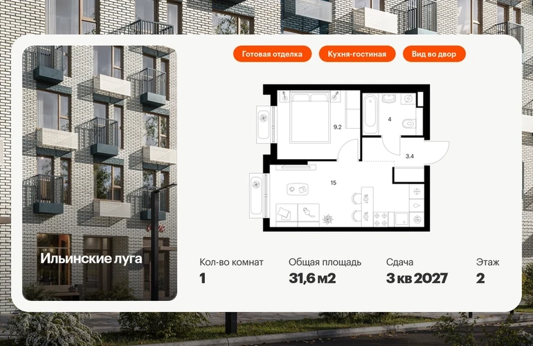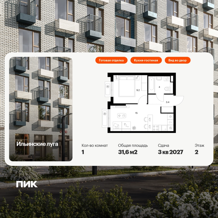 В Красногорске Московской области продаётся 1-комнатная квартира квартира площадью 31.6 на 2 этаже 9 этажного дома (корпус 3.3, секция 3) в проекте ПИК «Ильинские луга». Удобное расположение 20 минут на автомобиле до станций метро «Волоколамская», «Тушинская» и «Строгино». 20 минут на машине до МЦД «Павшино». 5 минут на автомобиле до ТЦ «РИГАМОЛЛ» и 10 минут до ТЦ «Твой дом» и гипермаркета «Глобус». 10 минут на автомобиле до музея-заповедника Архангельское. Особенности проекта «Ильинские луга» — масштабный проект с собственной инфраструктурой и атмосферой загородной жизни. Удобные и разнообразные планировки позволят каждому выбрать квартиру под собственный сценарий жизни. Преимущества проекта: Отделка: Готовая Особенности планировки: Кухня-гостиная Светлые и просторные холлы с быстрыми тихими лифтами. Девять детских садов, четыре школы и современная поликлиника на территории проекта. Дворы-парки с местами для отдыха, детскими и спортивными площадками. Пешеходный бульвар для прогулок и отдыха. PlayHub «Гравити» — большая игровая площадка для детей. Магазины, кафе и полезные сервисы на первых этажах домов. Наземный паркинг с зарядными станциями для электрокаров. АртикулО застройщике