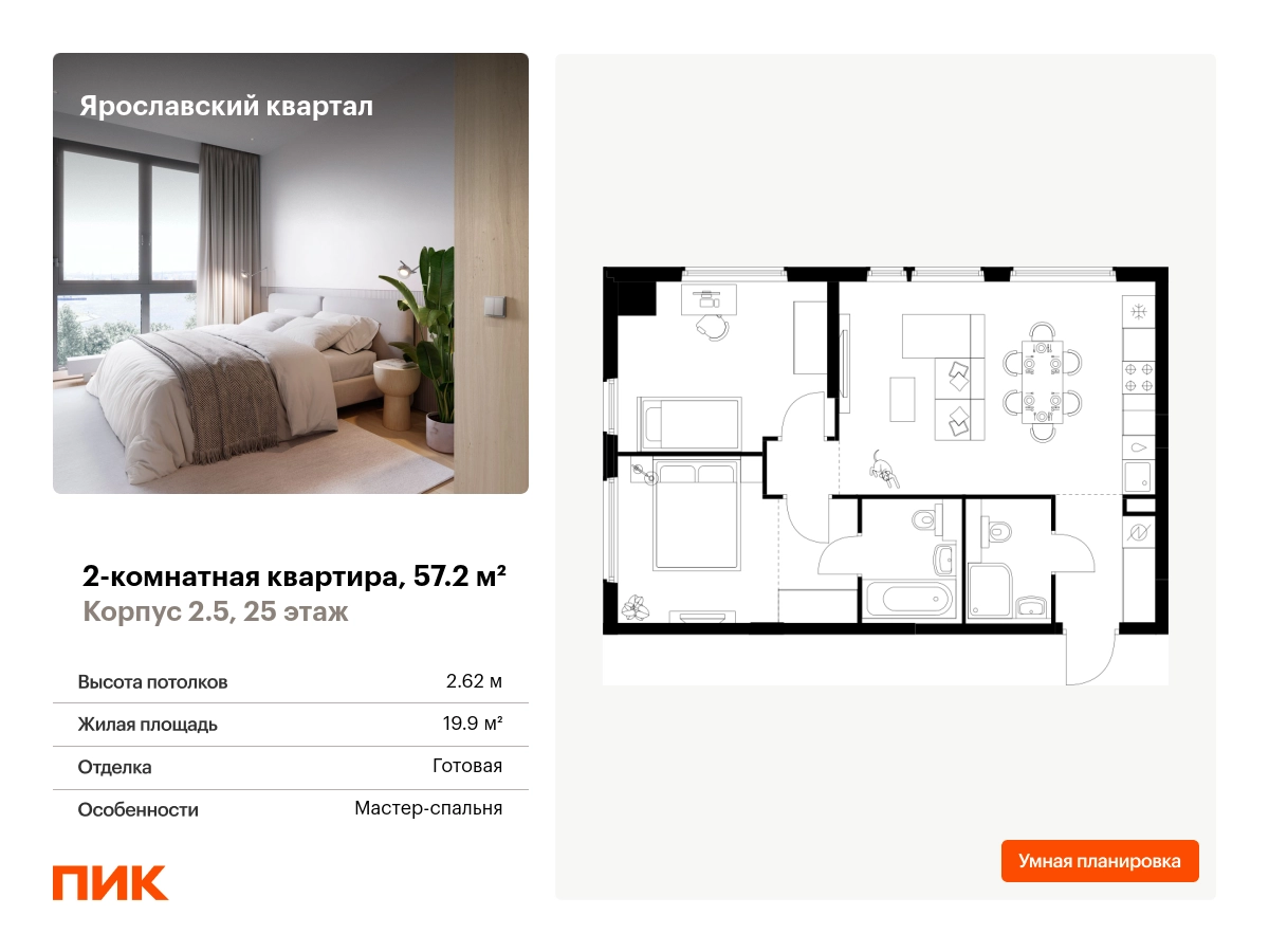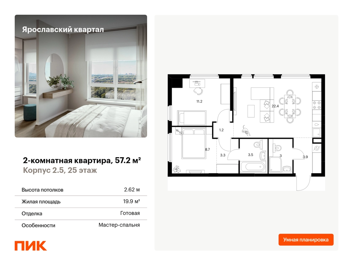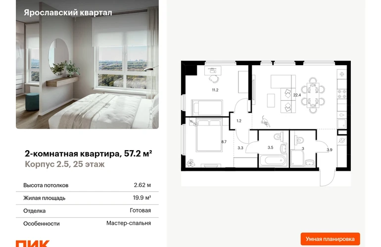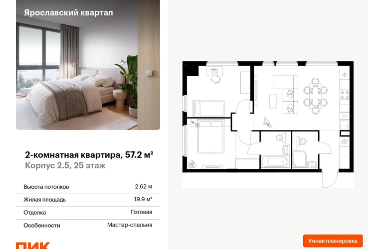 Продаётся 2-комн.квартира площадью 57.20 кв.м на 25 этаже 25 этажного дома (Корпус 2.5, секция 2) проекта ПИК Ярославский квартал. Светлый просторный подъезд на уровне земли, функциональная планировка, большие окна, с отделкой. Проект «Ярославский квартал» возводится в Мытищах, в 6 км от МКАД. Жилой квартал, состоящий из 8 корпусов, строится рядом с Ярославским шоссе и имеет удобный заезд с крупной автомагистрали. На территории проекта появится школа, детский сад и пешеходный бульвар. Индивидуальные дизайны фасадов для «Ярославского квартала» разработало петербургское архитектурное бюро RHIZOME. В их портфолио вошли работы для Московского музея современного искусства, ГЦСИ, Манифеста 10 и ЦВЗ Манеж. За 7 минут можно дойти пешком до ближайшей автобусной остановки. Столько же займёт дорога до «Лосиного острова» — облагороженного парка с разными активностями для всей семьи, благоустроенными зонами для отдыха, местами для прогулок и пробежек на свежем воздухе. Доехать на автомобиле до Ярославского шоссе получится за 3 минуты, до станции «Мытищи» — за 9 минут, до МКАД — за 15 минут. Артикул - 994491О застройщике