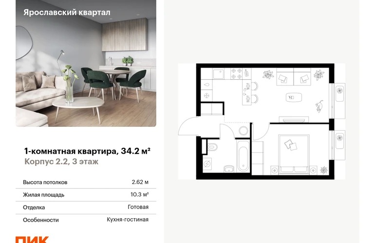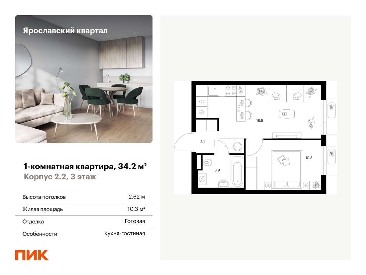 Продаётся 1-комн.квартира площадью 34.20 кв.м на 3 этаже 25 этажного дома (Корпус 2.2, секция 1) проекта ПИК Ярославский квартал. Светлый просторный подъезд на уровне земли, функциональная планировка, большие окна, с отделкой. Проект «Ярославский квартал» возводится в Мытищах, в 6 км от МКАД. Жилой квартал, состоящий из 8 корпусов, строится рядом с Ярославским шоссе и имеет удобный заезд с крупной автомагистрали. На территории проекта появится школа, детский сад и пешеходный бульвар. Индивидуальные дизайны фасадов для «Ярославского квартала» разработало петербургское архитектурное бюро. В их портфолио вошли работы для Московского музея современного искусства, ГЦСИ, Манифеста 10 и ЦВЗ Манеж. За 7 минут можно дойти пешком до ближайшей автобусной остановки. Столько же займёт дорога до «Лосиного острова» — облагороженного парка с разными активностями для всей семьи, благоустроенными зонами для отдыха, местами для прогулок и пробежек на свежем воздухе. Доехать на автомобиле до Ярославского шоссе получится за 3 минуты, до станции «Мытищи» — за 9 минут, до МКАД — за 15 минут. Артикул - 1013044О застройщике