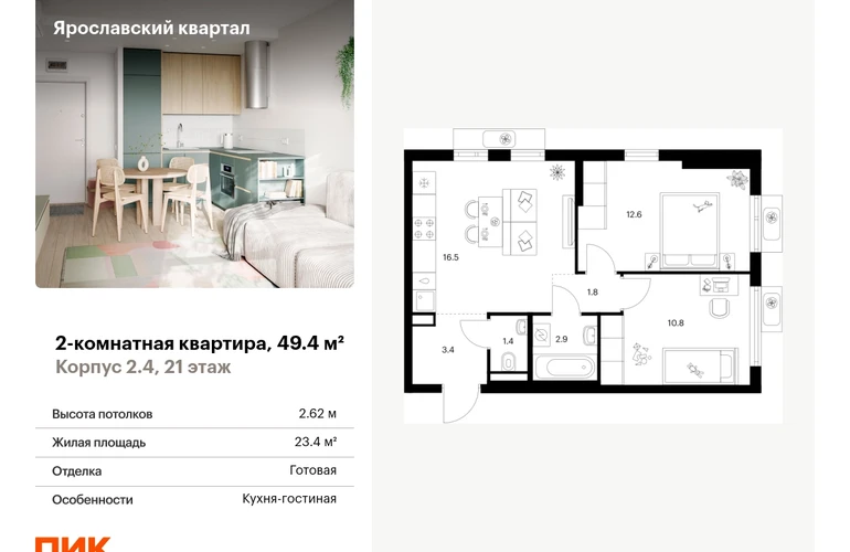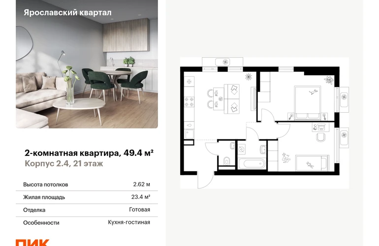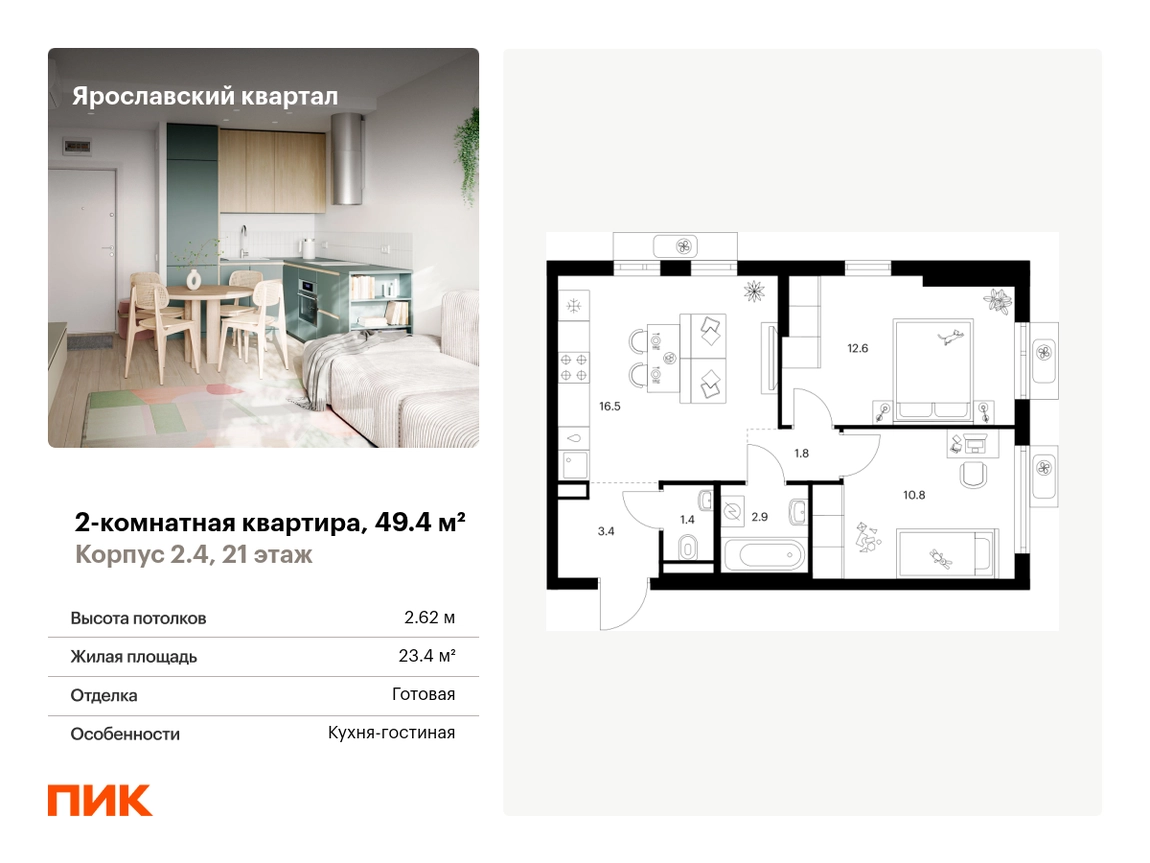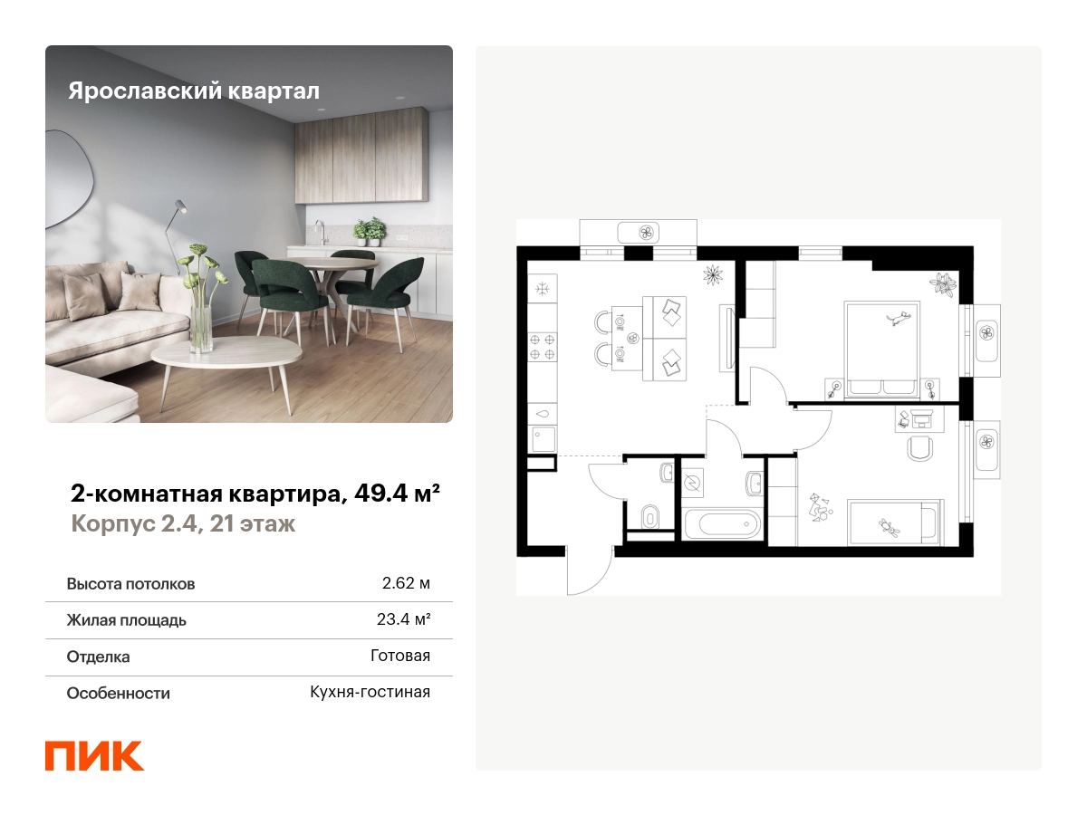 Продаётся 2-комн.квартира площадью 49.40 кв.м на 21 этаже 25 этажного дома (Корпус 2.4, секция 1) проекта ПИК Ярославский квартал. Светлый просторный подъезд на уровне земли, функциональная планировка, большие окна, с отделкой. Проект «Ярославский квартал» возводится в Мытищах, в 6 км от МКАД. Жилой квартал, состоящий из 8 корпусов, строится рядом с Ярославским шоссе и имеет удобный заезд с крупной автомагистрали. На территории проекта появится школа, детский сад и пешеходный бульвар. Индивидуальные дизайны фасадов для «Ярославского квартала» разработало петербургское архитектурное бюро RHIZOME. В их портфолио вошли работы для Московского музея современного искусства, ГЦСИ, Манифеста 10 и ЦВЗ Манеж. За 7 минут можно дойти пешком до ближайшей автобусной остановки. Столько же займёт дорога до «Лосиного острова» — облагороженного парка с разными активностями для всей семьи, благоустроенными зонами для отдыха, местами для прогулок и пробежек на свежем воздухе. Доехать на автомобиле до Ярославского шоссе получится за 3 минуты, до станции «Мытищи» — за 9 минут, до МКАД — за 15 минут. Артикул - 1013596О застройщике