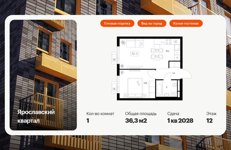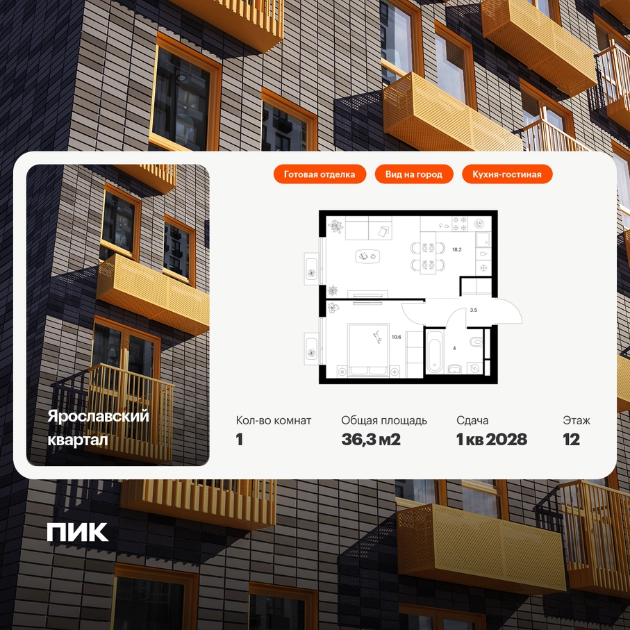 Продаётся 1-комн.квартира площадью 36.30 кв.м на 12 этаже 25 этажного дома (Корпус 2.2, секция 1) проекта ПИК Ярославский квартал. Светлый просторный подъезд на уровне земли, функциональная планировка, большие окна, с отделкой. Проект «Ярославский квартал» возводится в Мытищах, в 6 км от МКАД. Жилой квартал, состоящий из 8 корпусов, строится рядом с Ярославским шоссе и имеет удобный заезд с крупной автомагистрали. На территории проекта появится школа, детский сад и пешеходный бульвар. Индивидуальные дизайны фасадов для «Ярославского квартала» разработало петербургское архитектурное бюро RHIZOME. В их портфолио вошли работы для Московского музея современного искусства, ГЦСИ, Манифеста 10 и ЦВЗ Манеж. За 7 минут можно дойти пешком до ближайшей автобусной остановки. Столько же займёт дорога до «Лосиного острова» — облагороженного парка с разными активностями для всей семьи, благоустроенными зонами для отдыха, местами для прогулок и пробежек на свежем воздухе. Доехать на автомобиле до Ярославского шоссе получится за 3 минуты, до станции «Мытищи» — за 9 минут, до МКАД — за 15 минут. Артикул - 1013161О застройщике