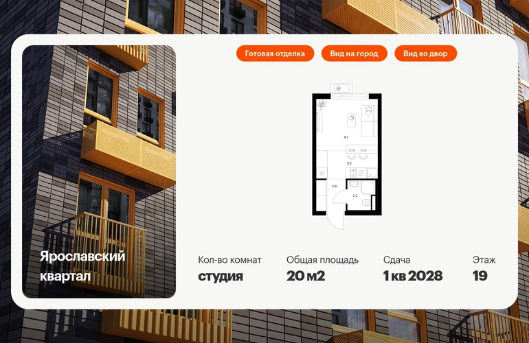 Продаётся квартира-студия площадью 20.00 кв.м на 19 этаже 25 этажного дома (Корпус 2.4, секция 1) проекта ПИК Ярославский квартал. Светлый просторный подъезд на уровне земли, функциональная планировка, большие окна, с отделкой. Проект «Ярославский квартал» возводится в Мытищах, в 6 км от МКАД. Жилой квартал, состоящий из 8 корпусов, строится рядом с Ярославским шоссе и имеет удобный заезд с крупной автомагистрали. На территории проекта появится школа, детский сад и пешеходный бульвар. Индивидуальные дизайны фасадов для «Ярославского квартала» разработало петербургское архитектурное бюро RHIZOME. В их портфолио вошли работы для Московского музея современного искусства, ГЦСИ, Манифеста 10 и ЦВЗ Манеж. За 7 минут можно дойти пешком до ближайшей автобусной остановки. Столько же займёт дорога до «Лосиного острова» — облагороженного парка с разными активностями для всей семьи, благоустроенными зонами для отдыха, местами для прогулок и пробежек на свежем воздухе. Доехать на автомобиле до Ярославского шоссе получится за 3 минуты, до станции «Мытищи» — за 9 минут, до МКАД — за 15 минут. Артикул - 1013574О застройщике