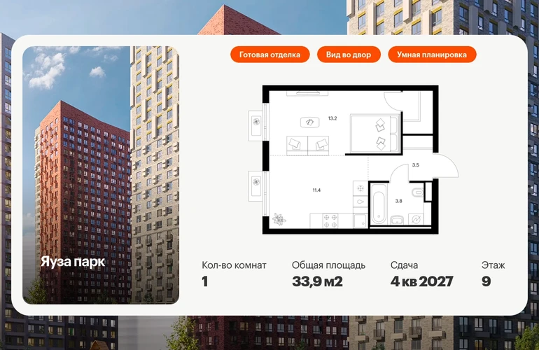 В Мытищах Московской области продаётся 1-комнатная квартира квартира площадью 33.9 на 9 этаже 24 этажного дома (корпус 14, секция 1) в проекте ПИК «Яуза парк». Удобное расположение 5 минут пешком до ж/д станции Мытищи и 20 минут на автомобиле до метро «Медведково». 3 минуты на автомобиле до Ярославского шоссе и 10 минут до МКАД. 8 минут пешком до ТРЦ «Красный кит». 20 минут пешком набережной реки Яузы и Мытищинского парка культуры и отдыха. Особенности проекта «Яуза парк» — современный квартал с архитектурой от бюро KATARSIS и RHIZOME. В проекте будет вся необходимая инфраструктура. А удобные и разнообразные планировки позволят каждому выбрать квартиру для собственного сценария жизни. Преимущества проекта: Отделка:Готовая Особенности планировки: Гардеробная, Умная планировка Два детских сада на 225 и 350 мест, школа для 1170 учеников и поликлиника на территории проекта. Дворы-парки с детскими и спортивными площадками. Пешеходный бульвар для прогулок и отдыха с отреставрированной водонапорной башней XIX века. Магазины, кафе и полезные сервисы на первых этажах домов. Многоуровневые и подземный паркинги. АртикулО застройщике