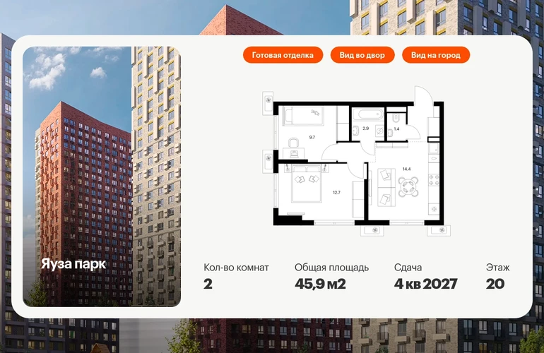 В Мытищах Московской области продаётся 2-комнатная квартира квартира площадью 45.9 на 20 этаже 24 этажного дома (корпус 14, секция 1) в проекте ПИК «Яуза парк». Удобное расположение 5 минут пешком до ж/д станции Мытищи и 20 минут на автомобиле до метро «Медведково». 3 минуты на автомобиле до Ярославского шоссе и 10 минут до МКАД. 8 минут пешком до ТРЦ «Красный кит». 20 минут пешком набережной реки Яузы и Мытищинского парка культуры и отдыха. Особенности проекта «Яуза парк» — современный квартал с архитектурой от бюро KATARSIS и RHIZOME. В проекте будет вся необходимая инфраструктура. А удобные и разнообразные планировки позволят каждому выбрать квартиру для собственного сценария жизни. Преимущества проекта: Отделка:Готовая Два детских сада на 225 и 350 мест, школа для 1170 учеников и поликлиника на территории проекта. Дворы-парки с детскими и спортивными площадками. Пешеходный бульвар для прогулок и отдыха с отреставрированной водонапорной башней XIX века. Магазины, кафе и полезные сервисы на первых этажах домов. Многоуровневые и подземный паркинги. АртикулО застройщике