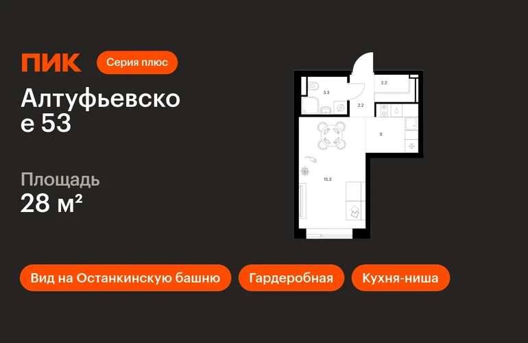В Алтуфьевском районе продаётся студия квартира площадью 28 на 31 этаже 32 этажного дома (корпус, секция) в проекте ПИК «Алтуфьевское 53». Удобное расположение 15 минут на общественном транспорте до станции метро «Отрадное». 20 минут пешком до МЦД «Дегунино». 2 минуты на автомобиле до Алтуфьевского шоссе и 20 минут до ТТК. 9 минут на машине до Ботанического сада и ВДНХ. Особенности проекта «Алтуфьевское 53» — современный проект «Серии плюс» с авторской архитектурой в районе, где создана качественная среда для полноценной жизни, работы и отдыха. А удобные и разнообразные планировки позволят каждому выбрать квартиру для собственного сценария жизни. Преимущества проекта: Отделка: Готовая Особенности планировки: Гардеробная, Кухня-ниша, Вид на Останкинскую башню, Умная планировка Лобби с дизайнерской отделкой, зонами ожидания, гостевыми санузлами и колясочными. Два детских сада с бассейном для 200 и 225 малышей и школа для 1000 учеников в минуте ходьбы от проекта. Дворы-парки с местами для отдыха, игровыми и спортивными площадками. Подземный паркинг. АртикулО застройщике