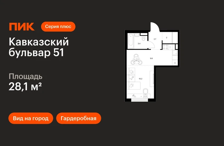 В районе Царицыно продаётся студия квартира площадью 28.1 на 4 этаже 32 этажного дома (корпус, секция) в проекте ПИК «Кавказский бульвар 51». Удобное расположение 17 минут пешком до станции метро «Кантемировская» и 20 минут до станции «Чертаново». 10 минут на машине до МКАД, 11 минут до Варшавского шоссе и 16 минут до ТТК. 8 минут пешком до Аршиновского и 13 минут до парка «Сосенки». 9 минут на автомобиле до музея-заповедника «Царицыно». Особенности проекта «Кавказский бульвар 51» — современный квартал в районе Царицыно. Проект частично реализован: первые дома уже сданы, а на первых этажах открыты магазины и полезные сервисы. В корпусах «Серии плюс» вас ждут продуманные планировки с мастер-спальней, кухней-гостиной и гардеробной. Преимущества проекта: Отделка: Готовая Особенности планировки: Гардеробная, Кухня-ниша, Умная планировка Дизайнерские лобби с быстрыми и тихими лифтами, кондиционерами, зонами ожидания и колясочными. Детский сад для 250 малышей и школа для 900 учеников на территории проекта. Пешеходный бульвар с местами для отдыха, игровыми и спортивными площадками. SportPark с футбольным и волейбольным полем, тренажёрами и памп-треком. Многоуровневый и подземные паркинги. Артикул _О застройщике