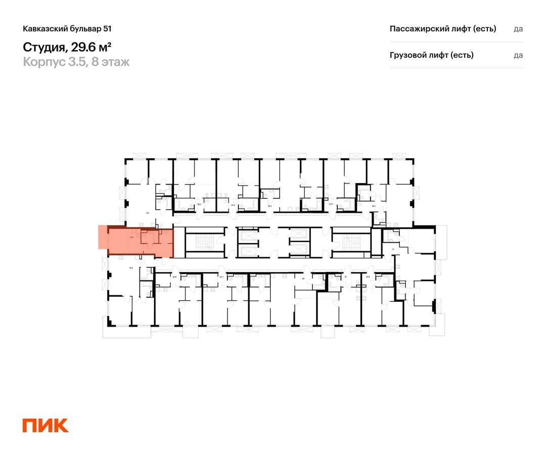 В районе Царицыно продаётся студия квартира площадью 29.6 на 8 этаже 24 этажного дома (корпус, секция) в проекте ПИК «Кавказский бульвар 51». Удобное расположение 17 минут пешком до станции метро «Кантемировская» и 20 минут до станции «Чертаново». 10 минут на машине до МКАД, 11 минут до Варшавского шоссе и 16 минут до ТТК. 8 минут пешком до Аршиновского и 13 минут до парка «Сосенки». 9 минут на автомобиле до музея-заповедника «Царицыно». Особенности проекта «Кавказский бульвар 51» — современный квартал в районе Царицыно. Проект частично реализован: первые дома уже сданы, а на первых этажах открыты магазины и полезные сервисы. В корпусах «Серии плюс» вас ждут продуманные планировки с мастер-спальней, кухней-гостиной и гардеробной. Преимущества проекта: Отделка: Предчистовая Особенности планировки: Гардеробная, Открытый балкон, Умная планировка Дизайнерские лобби с быстрыми и тихими лифтами, кондиционерами, зонами ожидания и колясочными. Детский сад для 250 малышей и школа для 900 учеников на территории проекта. Пешеходный бульвар с местами для отдыха, игровыми и спортивными площадками. SportPark с футбольным и волейбольным полем, тренажёрами и памп-треком. Многоуровневый и подземные паркинги. Артикул _О застройщике