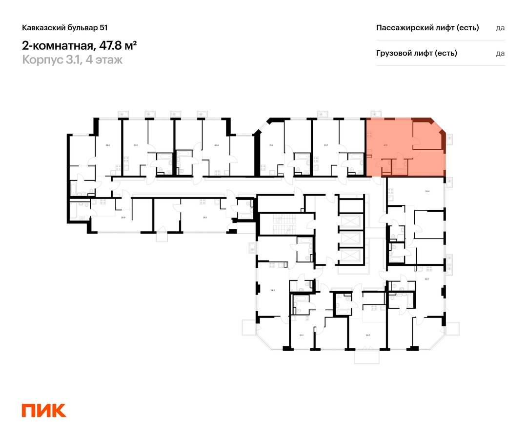 В районе Царицыно продаётся 2-комнатная квартира квартира площадью 47.8 на 4 этаже 23 этажного дома (корпус, секция) в проекте ПИК «Кавказский бульвар 51». Удобное расположение 17 минут пешком до станции метро «Кантемировская» и 20 минут до станции «Чертаново». 10 минут на машине до МКАД, 11 минут до Варшавского шоссе и 16 минут до ТТК. 8 минут пешком до Аршиновского и 13 минут до парка «Сосенки». 9 минут на автомобиле до музея-заповедника «Царицыно». Особенности проекта «Кавказский бульвар 51» — современный квартал в районе Царицыно. Проект частично реализован: первые дома уже сданы, а на первых этажах открыты магазины и полезные сервисы. В корпусах «Серии плюс» вас ждут продуманные планировки с мастер-спальней, кухней-гостиной и гардеробной. Преимущества проекта: Отделка: Готовая Особенности планировки: Кухня-гостиная Дизайнерские лобби с быстрыми и тихими лифтами, кондиционерами, зонами ожидания и колясочными. Детский сад для 250 малышей и школа для 900 учеников на территории проекта. Пешеходный бульвар с местами для отдыха, игровыми и спортивными площадками. SportPark с футбольным и волейбольным полем, тренажёрами и памп-треком. Многоуровневый и подземные паркинги. Артикул _О застройщике