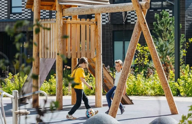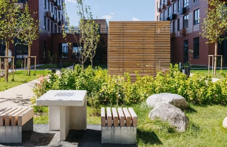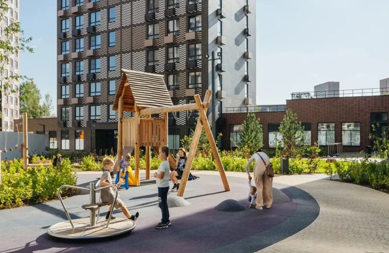 Во дворе «Ютаново» будет собственный парк с местами для отдыха, детскими и спортивными площадками. На первых этажах откроются магазины, кафе и другие сервисы.