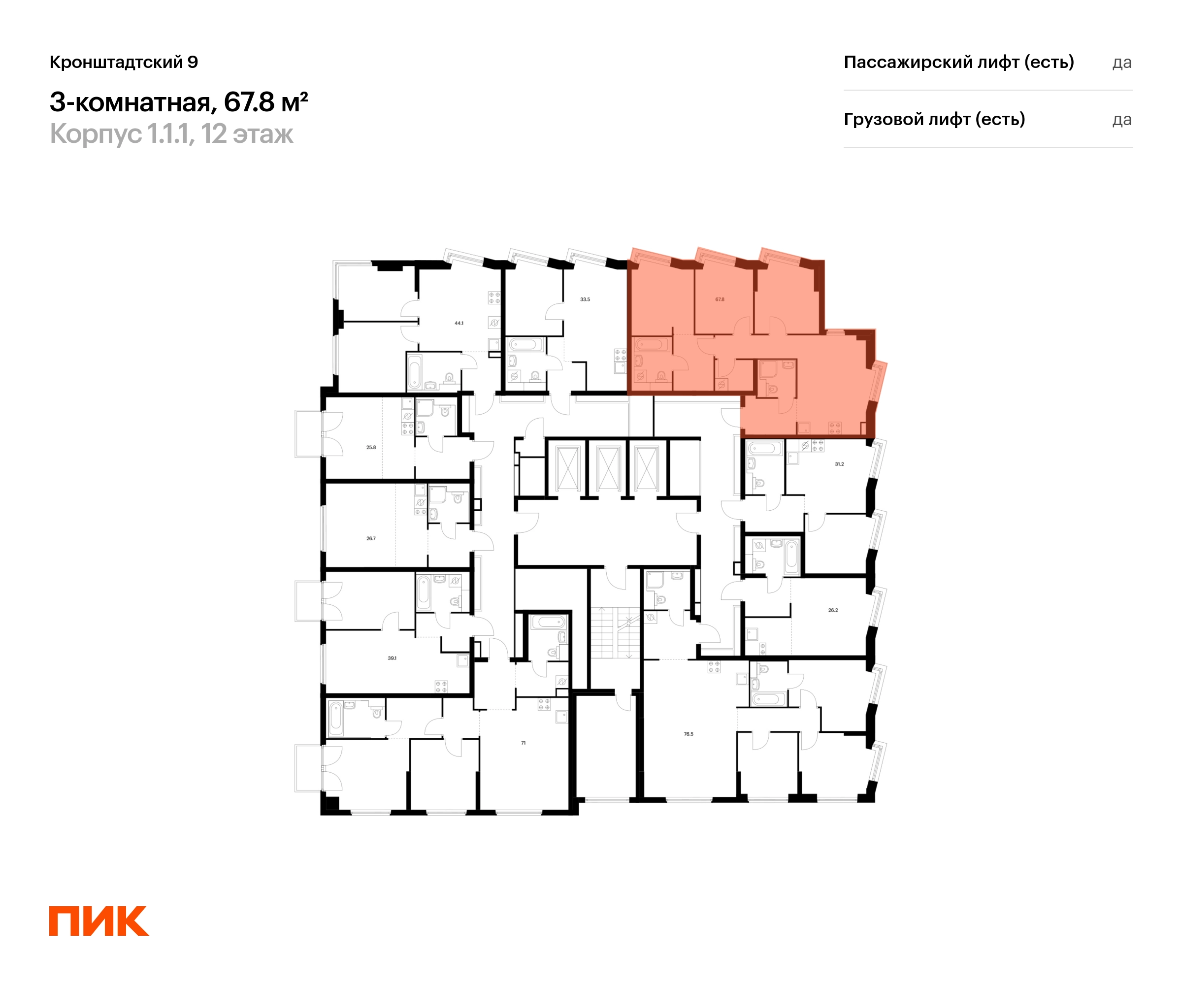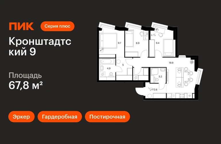В Головинском районе продаётся 3-комнатная квартира квартира площадью 67.8 на 12 этаже 12 этажного дома (корпус 1.1.1, секция 1) в проекте ПИК «Кронштадтский 9». Удобное расположение 3 минуты пешком до станции метро «Водный стадион». 2 минуты на автомобиле до Ленинградского шоссе, 10 минут до ТТК и 16 минут до МКАД. 4 минуты пешком до ТЦ «Водный». 15 минут пешком до парка у Головинских прудов и 18 минут до парка «Дружба». Особенности проекта «Кронштадтский 9» — квартал «Серии плюс» с уникальной архитектурой. У проекта собственная инфраструктура, а удобные и разнообразные планировки позволят каждому выбрать квартиру для собственного сценария жизни. Преимущества проекта: Отделка: Дизайнерские лобби с зонами ожидания, кондиционерами, быстрыми тихими лифтами. Два детских сада на территории проекта. Дворы-парки с игровыми и спортивными площадками. Магазины, кафе и полезные сервисы на первых этажах домов. Подземный паркинг. АртикулО застройщике