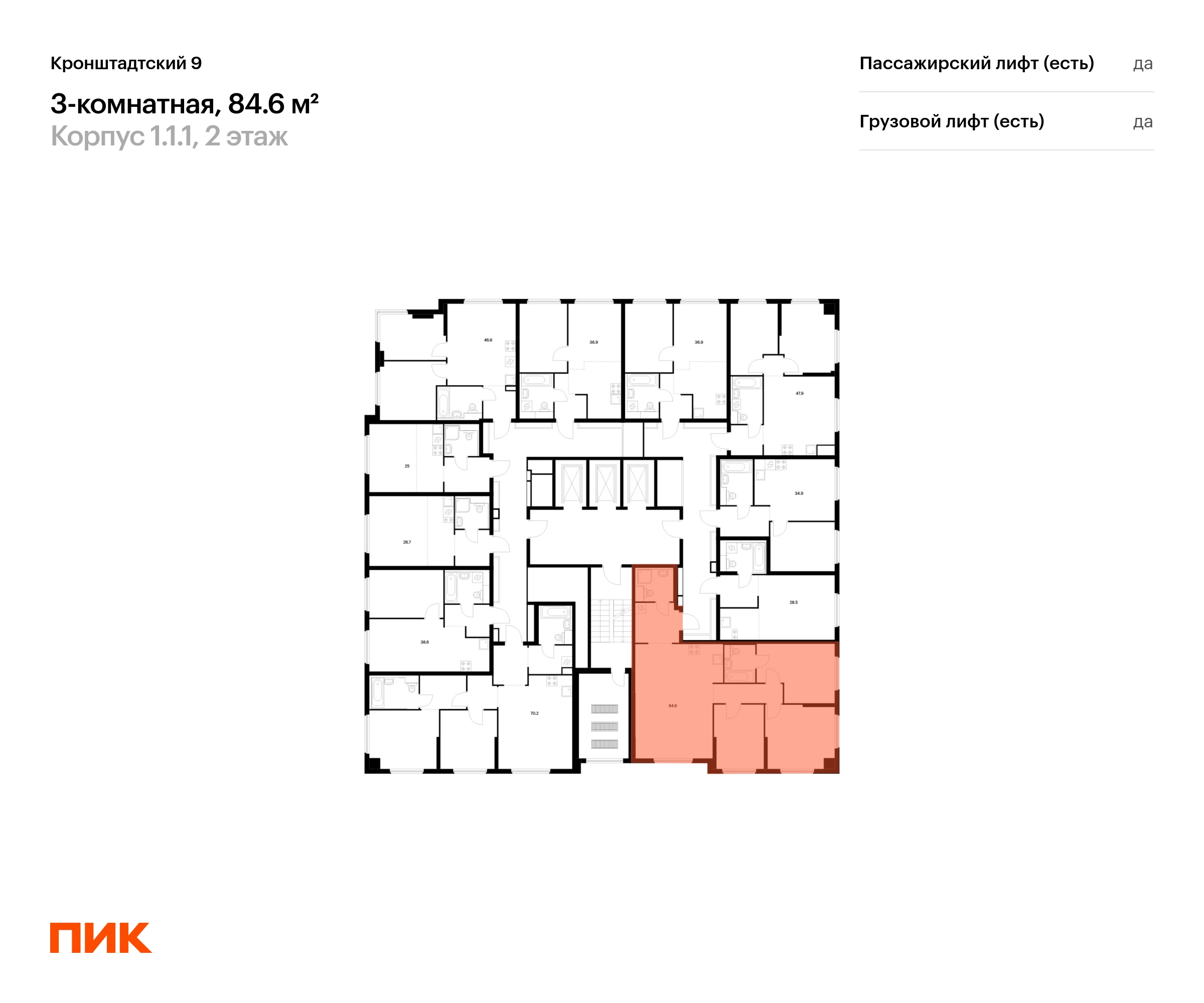 В Головинском районе продаётся 3-комнатная квартира квартира площадью 84.6 на 2 этаже 12 этажного дома (корпус 1.1.1, секция 1) в проекте ПИК «Кронштадтский 9». Удобное расположение 3 минуты пешком до станции метро «Водный стадион». 2 минуты на автомобиле до Ленинградского шоссе, 10 минут до ТТК и 16 минут до МКАД. 4 минуты пешком до ТЦ «Водный». 15 минут пешком до парка у Головинских прудов и 18 минут до парка «Дружба». Особенности проекта «Кронштадтский 9» — квартал «Серии плюс» с уникальной архитектурой. У проекта собственная инфраструктура, а удобные и разнообразные планировки позволят каждому выбрать квартиру для собственного сценария жизни. Преимущества проекта: Отделка: Дизайнерские лобби с зонами ожидания, кондиционерами, быстрыми тихими лифтами. Два детских сада на территории проекта. Дворы-парки с игровыми и спортивными площадками. Магазины, кафе и полезные сервисы на первых этажах домов. Подземный паркинг. АртикулО застройщике
