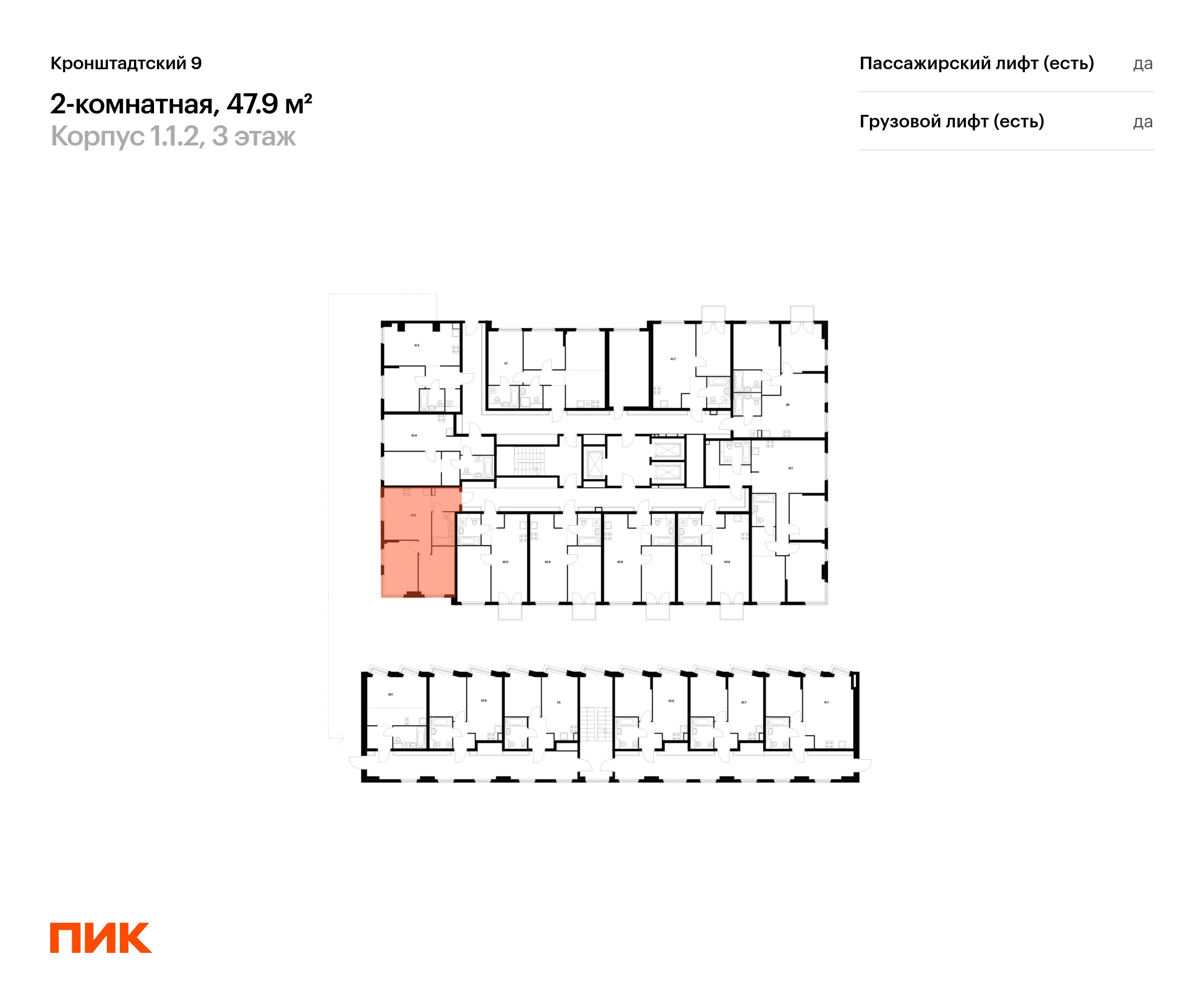 В Головинском районе продаётся 2-комнатная квартира квартира площадью 47.9 на 3 этаже 12 этажного дома (корпус 1.1.2, секция 2) в проекте ПИК «Кронштадтский 9». Удобное расположение 3 минуты пешком до станции метро «Водный стадион». 2 минуты на автомобиле до Ленинградского шоссе, 10 минут до ТТК и 16 минут до МКАД. 4 минуты пешком до ТЦ «Водный». 15 минут пешком до парка у Головинских прудов и 18 минут до парка «Дружба». Особенности проекта «Кронштадтский 9» — квартал «Серии плюс» с уникальной архитектурой. У проекта собственная инфраструктура, а удобные и разнообразные планировки позволят каждому выбрать квартиру для собственного сценария жизни. Преимущества проекта: Отделка: Дизайнерские лобби с зонами ожидания, кондиционерами, быстрыми тихими лифтами. Два детских сада на территории проекта. Дворы-парки с игровыми и спортивными площадками. Магазины, кафе и полезные сервисы на первых этажах домов. Подземный паркинг. АртикулО застройщике